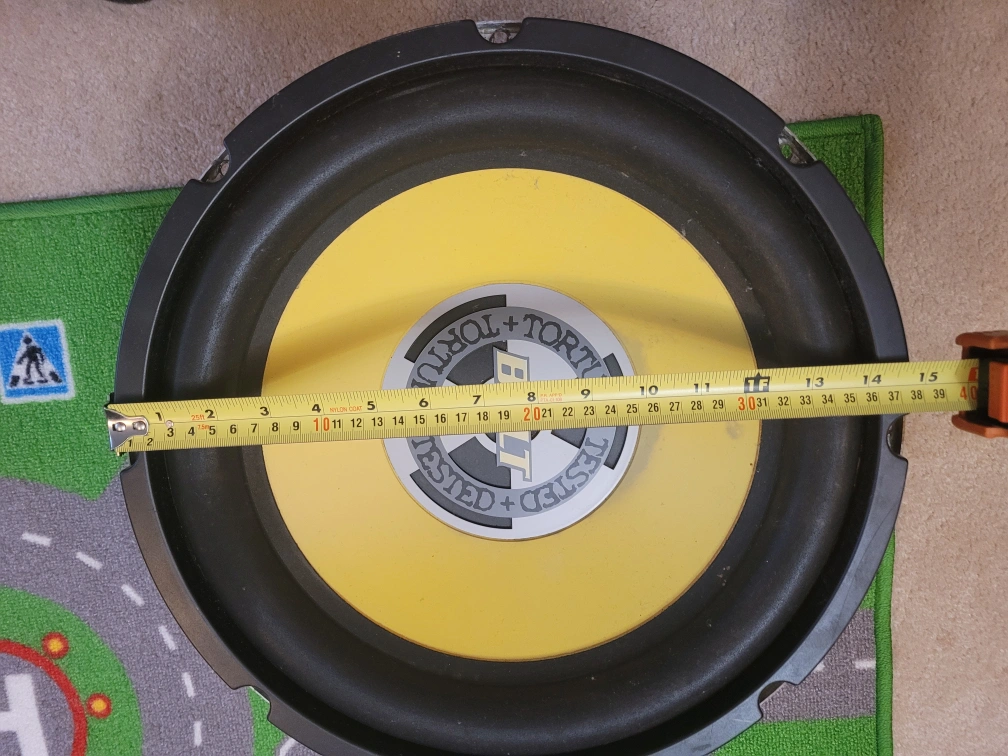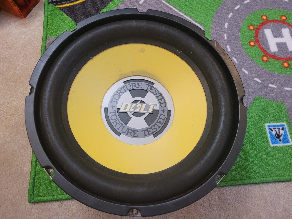 Lightning Audio Bolt B1.15.4 15-inch car subwoofer. Yellow cone, black surround. Features a large magnet structure. Impedance: 4 ohms. Sensitivity: 88.6dB. RMS Power Handling: 150W. Peak Power Handling: 300W. Suggested sealed box volume: 2.50 cubic ft. Shows some wear. Works well and can produce nice base Large elastic membrane with long travel. asking $50
