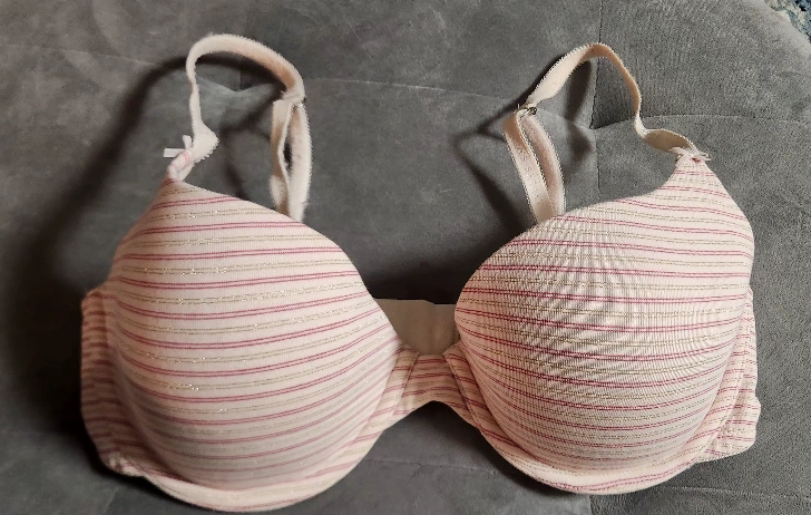 Victoria's Secret lined demi bra. Pink and gold striped pattern. Adjustable straps. Lightly padded cups. Bow detail on each strap. Size 34D.