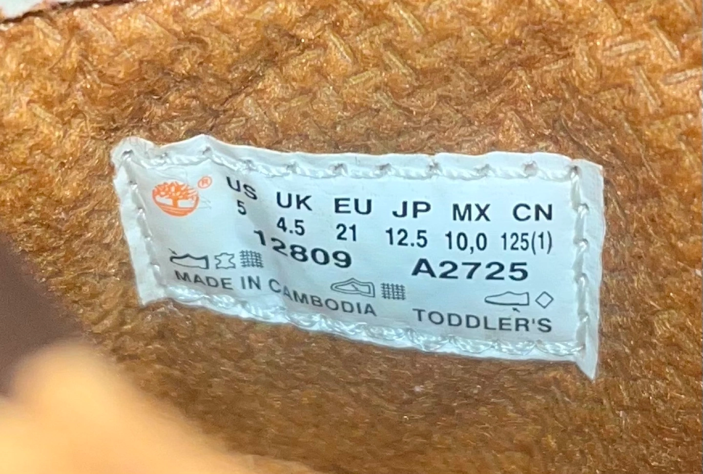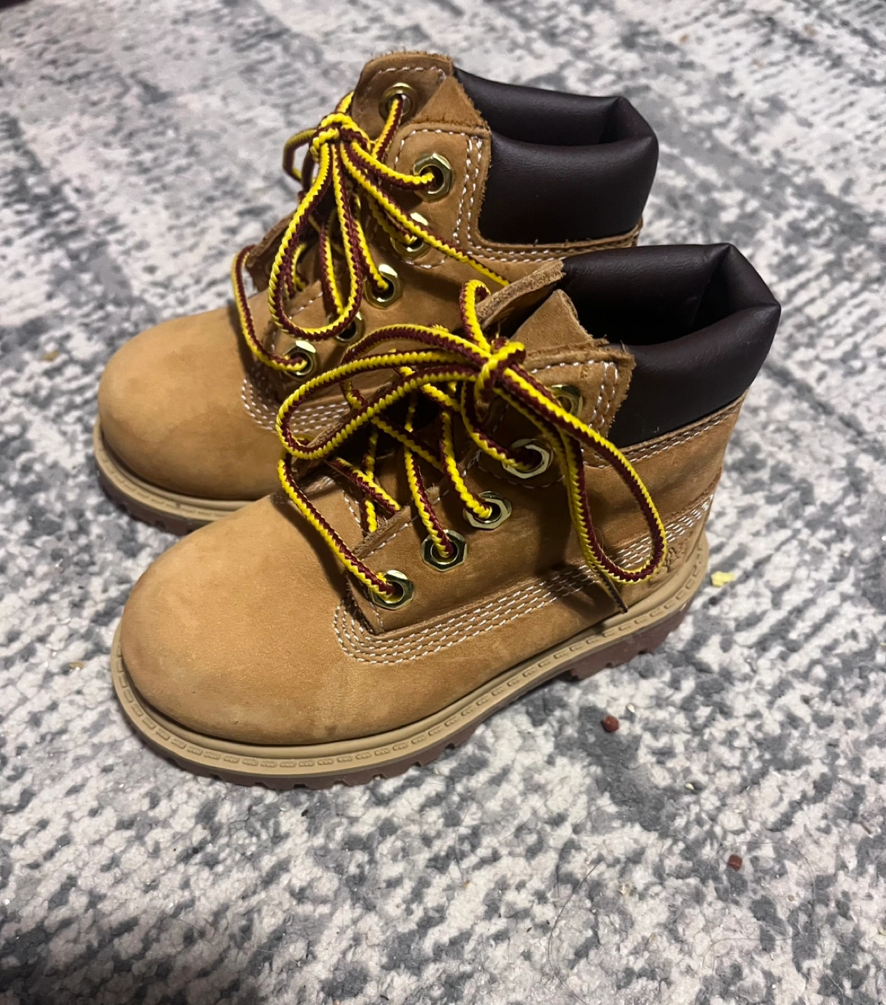 Tan leather boots. Yellow and red laces. Size 5 US. Toddler's size. Made in Cambodia.