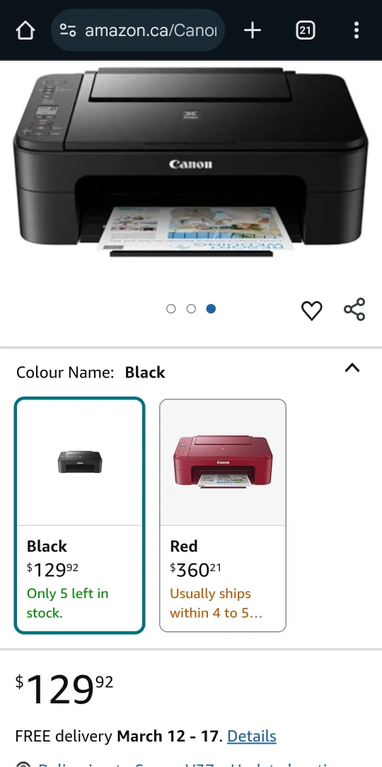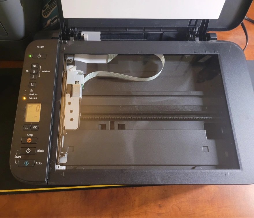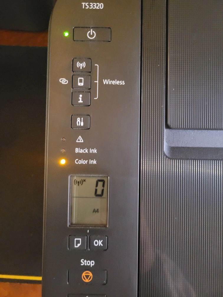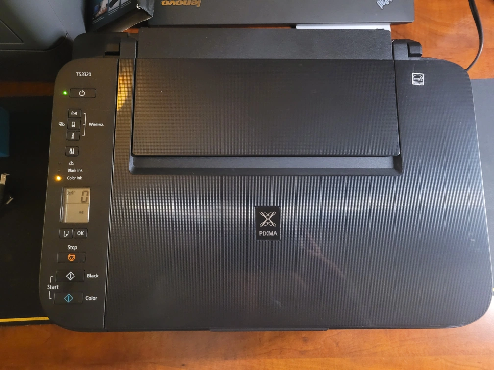 Canon PIXMA TS3320 multifunction printer. Wireless functionality. Includes scanner and copier. Black and colour ink cartridges. Not used in a while. Prints unevenly. Will need new inks