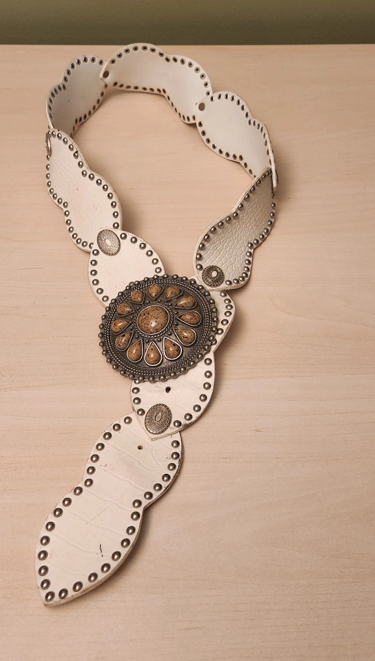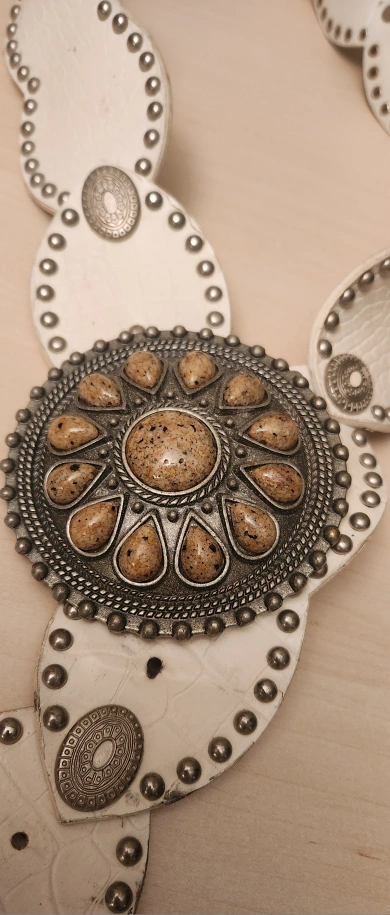 Stylish white leather belt. Features a large, ornate buckle with stone accents. Metal studs along the belt's edge. Scalloped design. Unique statement piece.