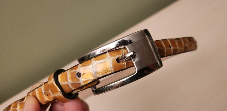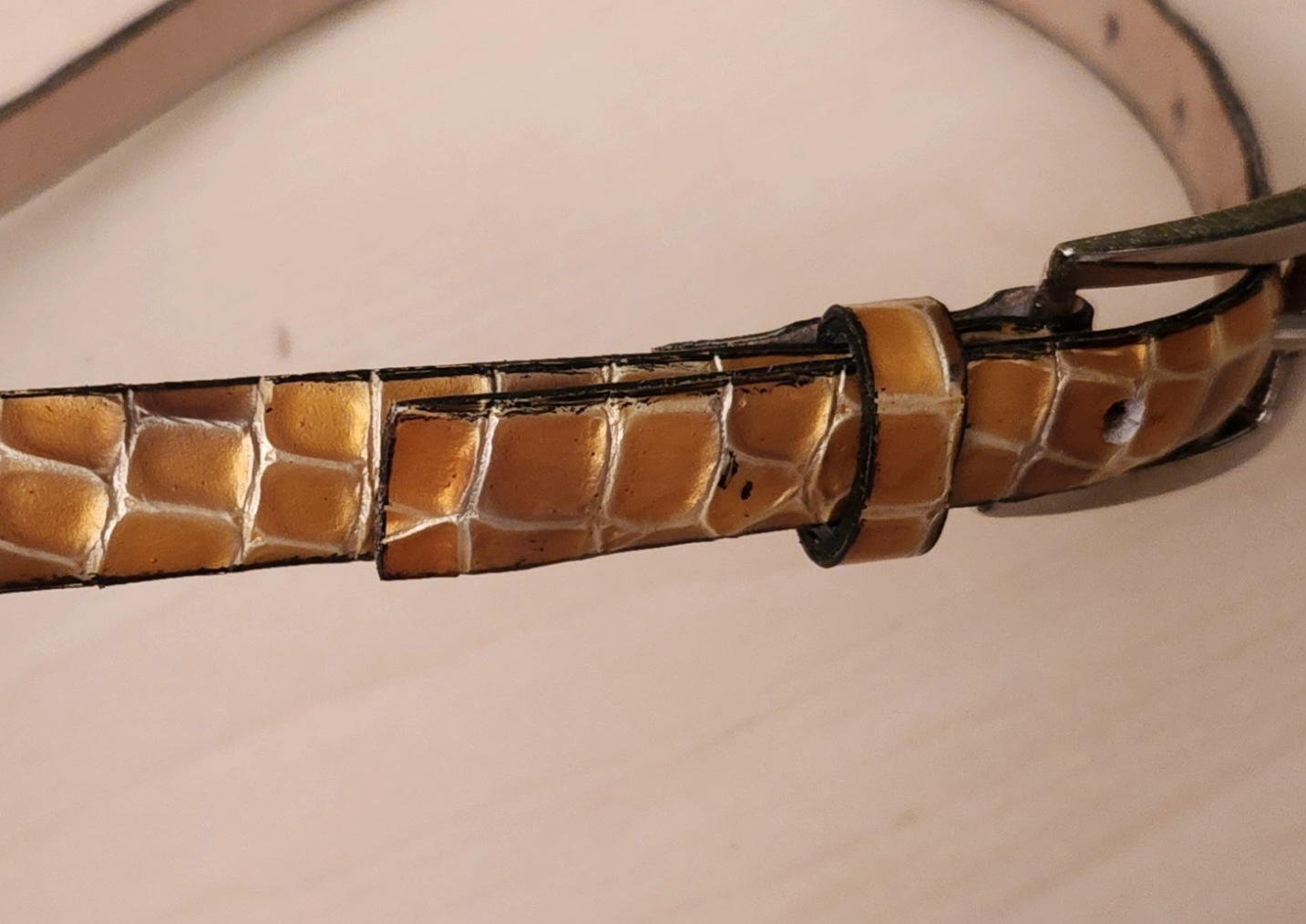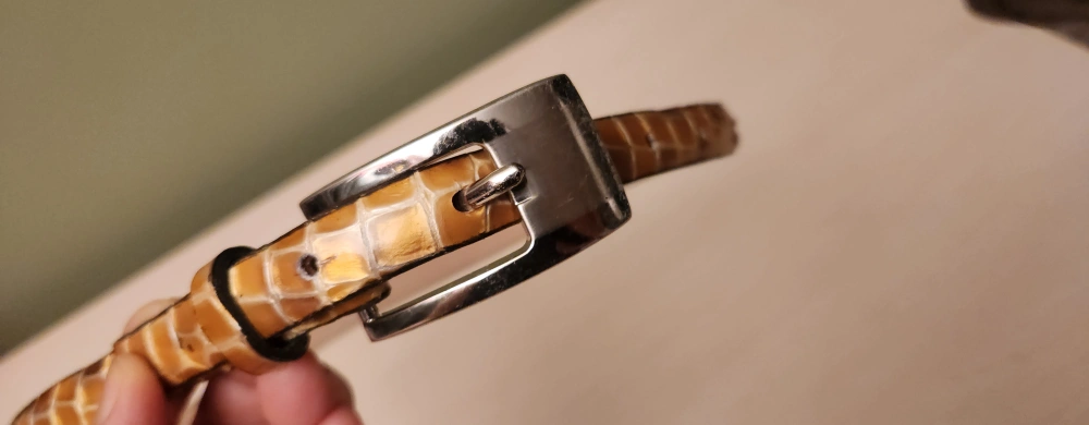 Women's gold coloured belt. Crocodile embossed leather. Silver-toned buckle. Slim design. Pre-owned.