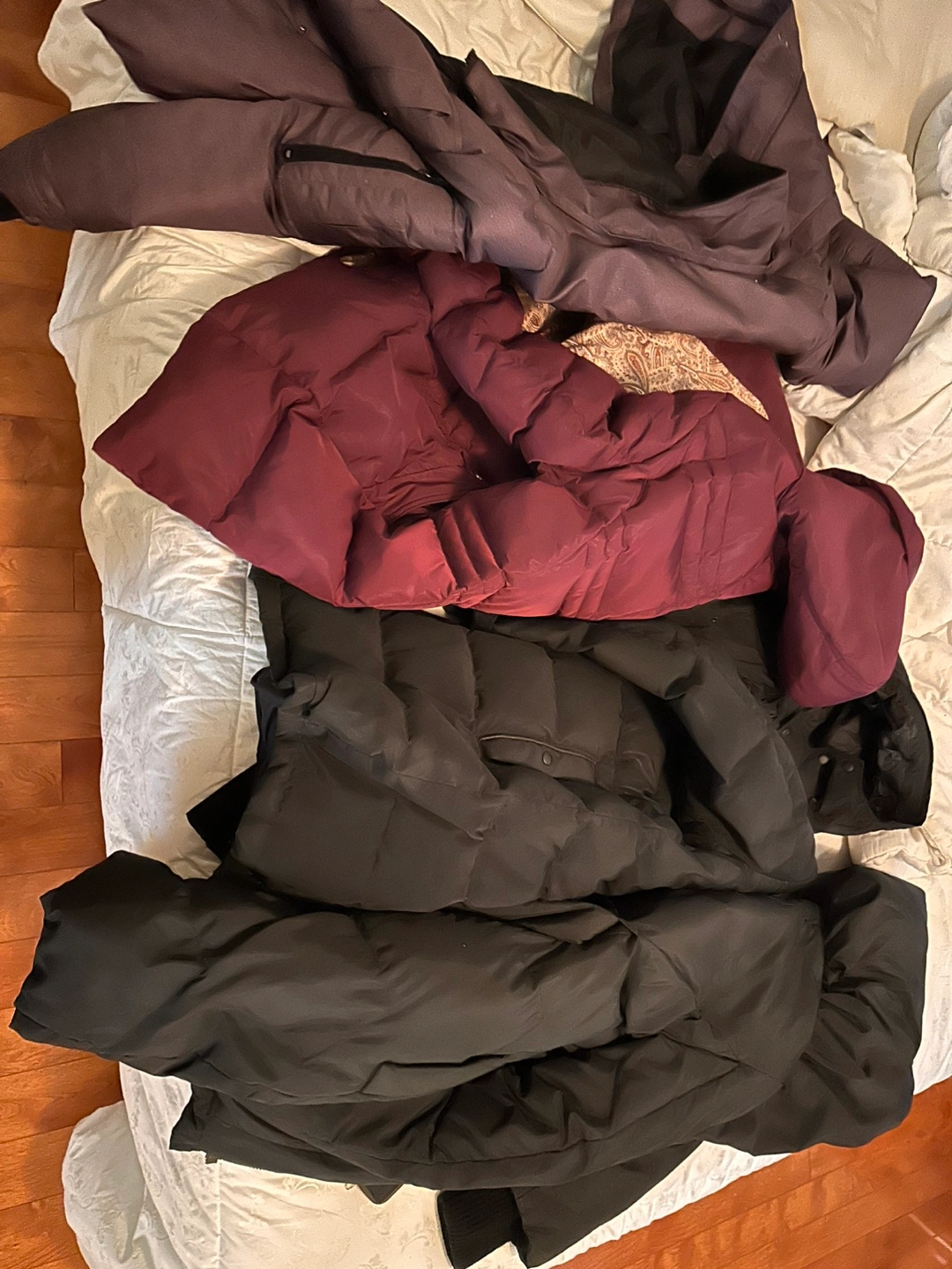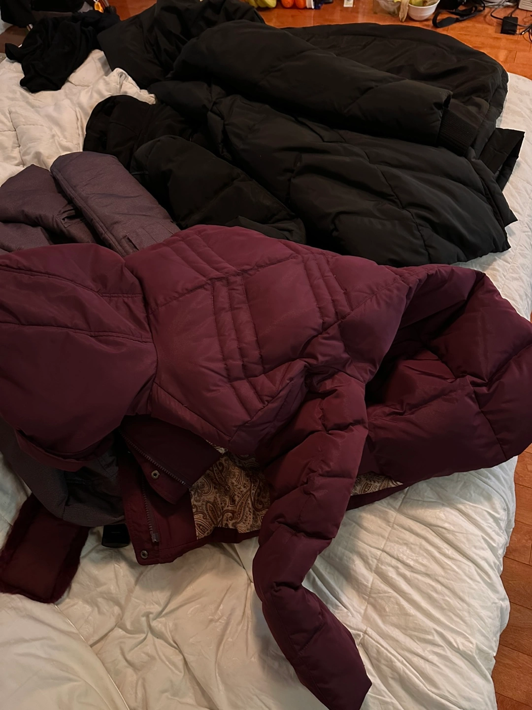 Four winter jackets in a bundle. Burgundy, dark grey, and two black puffer jackets. Great for cold weather. Various sizes.