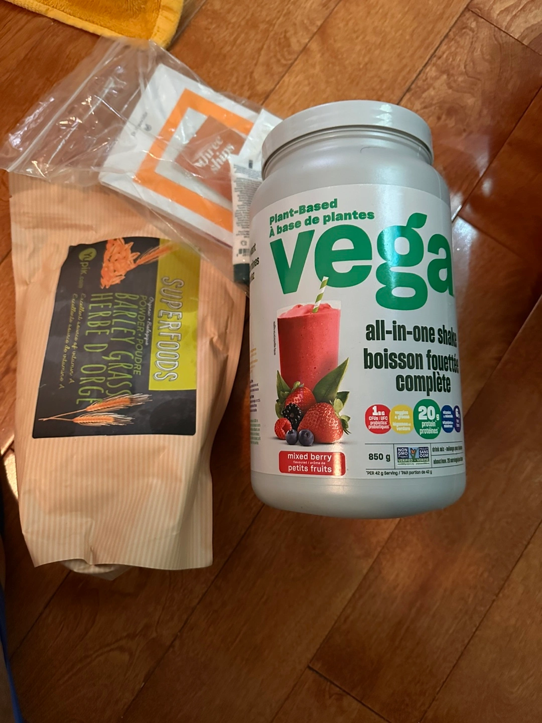 Vega plant-based all-in-one shake, mixed berry flavour. 850g container. Also includes barley grass powder.