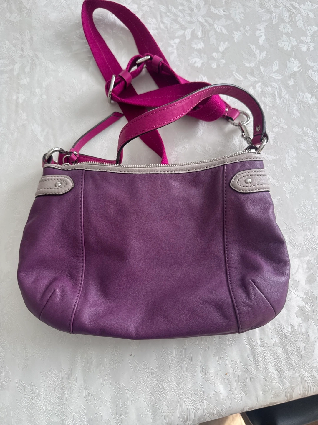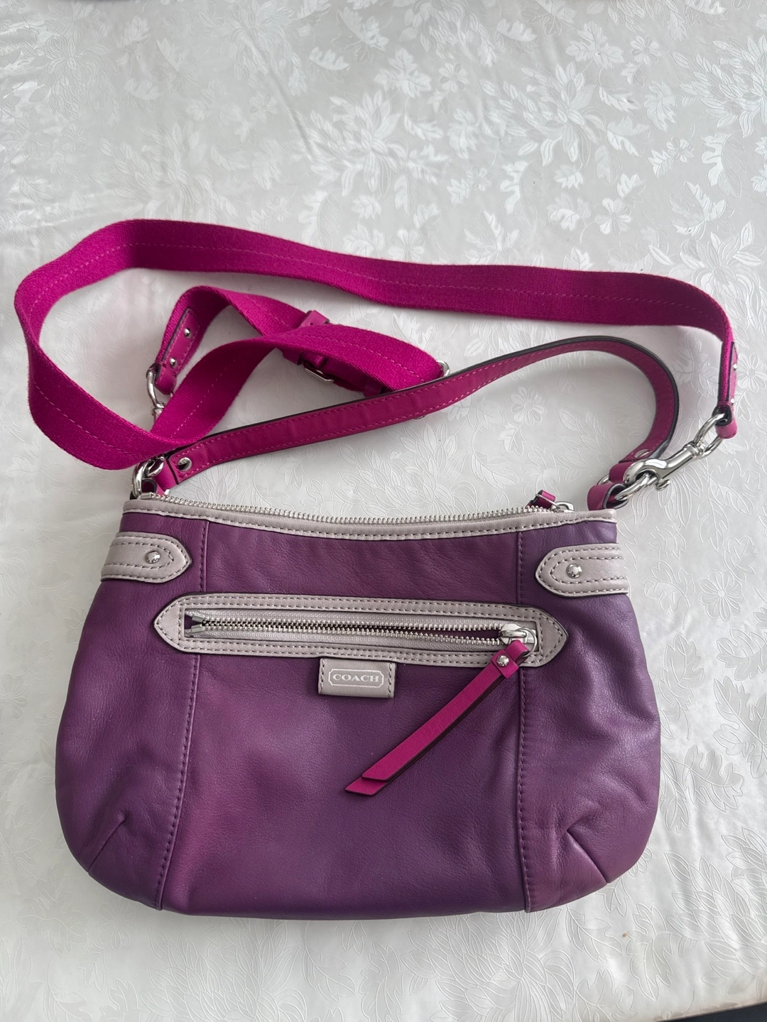 Pre-owned Coach crossbody bag. Purple leather exterior, grey accents. Zipper closure. Adjustable strap. Interior pockets. Excellent condition.
