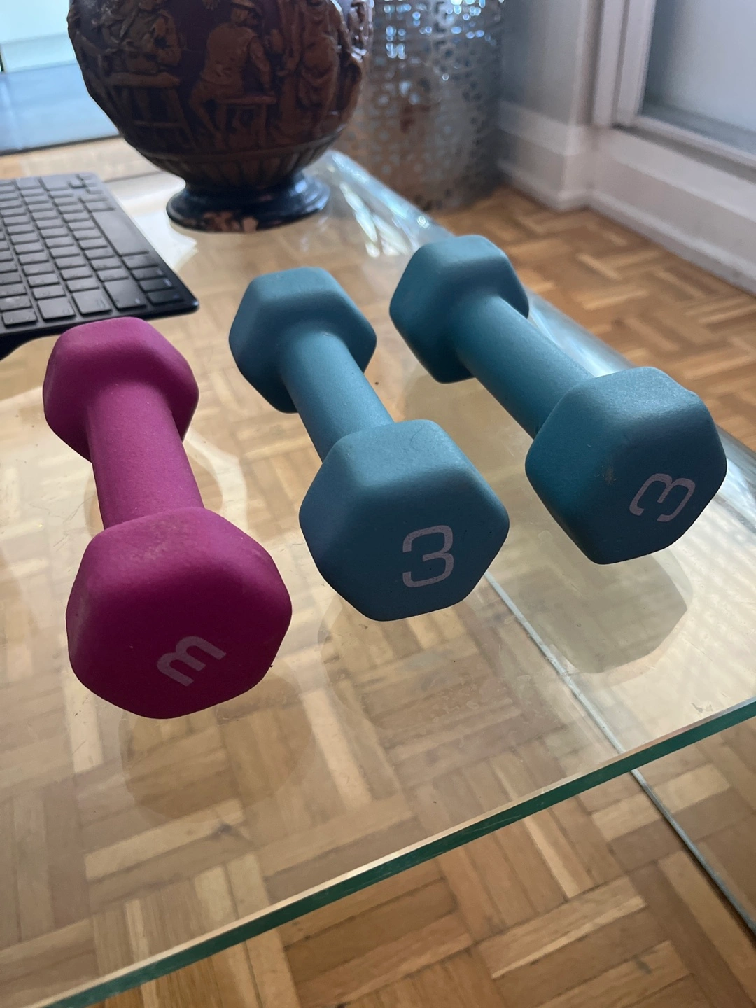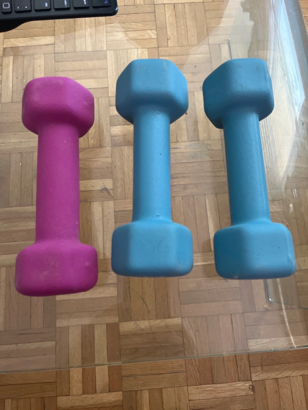 Three 3lb neoprene dumbbells. Two teal, one purple. Great for home workouts. Used but in good condition. You can pick up by Carlton and Jarvis area