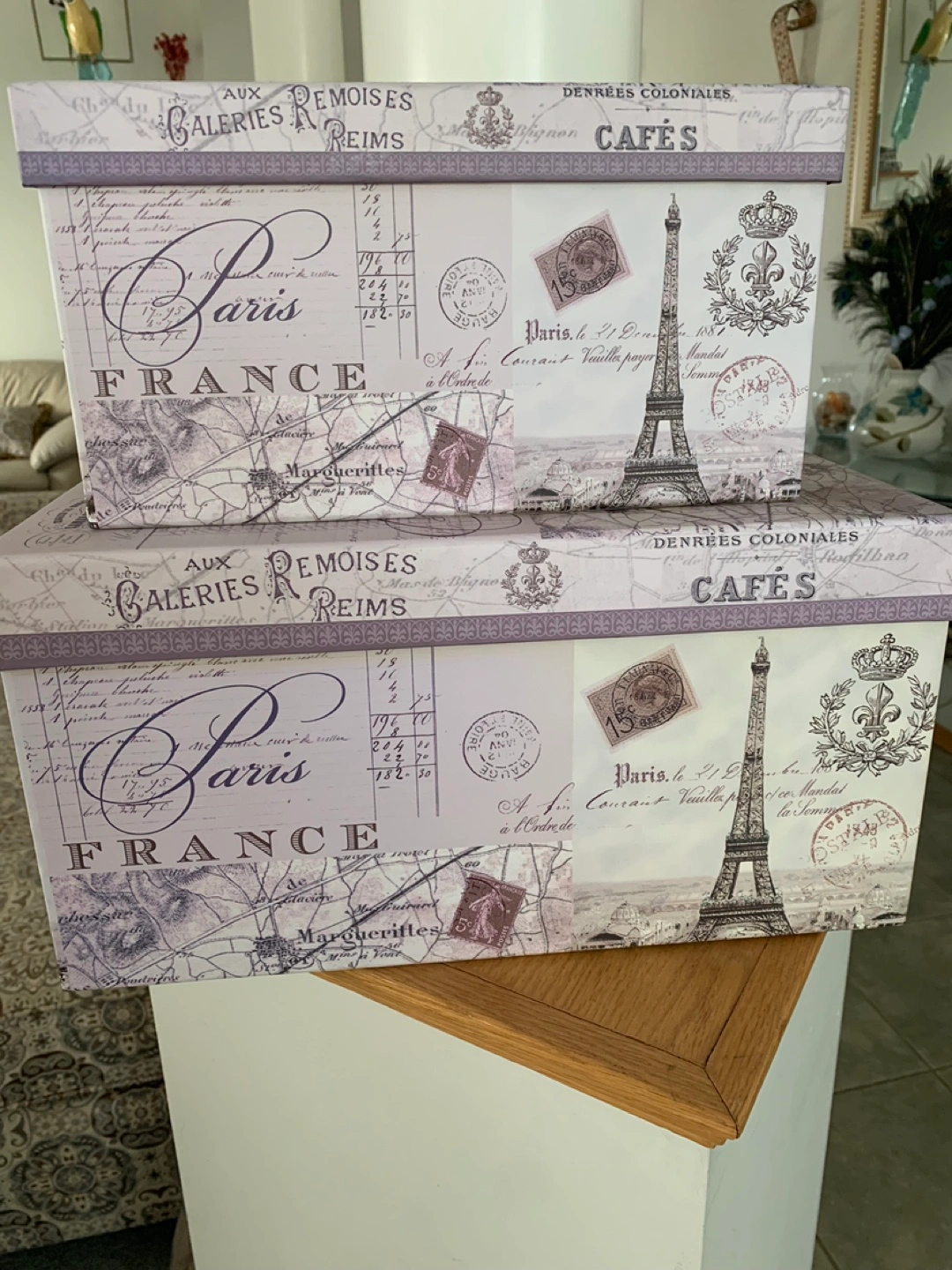 Two decorative storage boxes. Feature a Parisian theme with Eiffel Tower imagery, postage stamps, and French script. Lilac and off-white colour scheme.