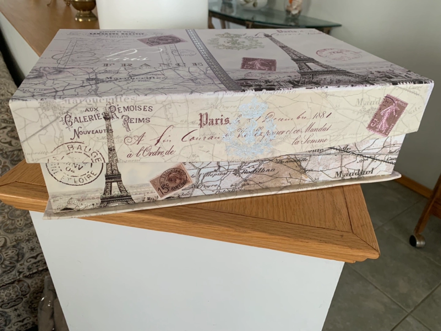 Vintage-style box featuring a Parisian theme. Ideal for storage or display. Features images of the Eiffel Tower and postage stamps.