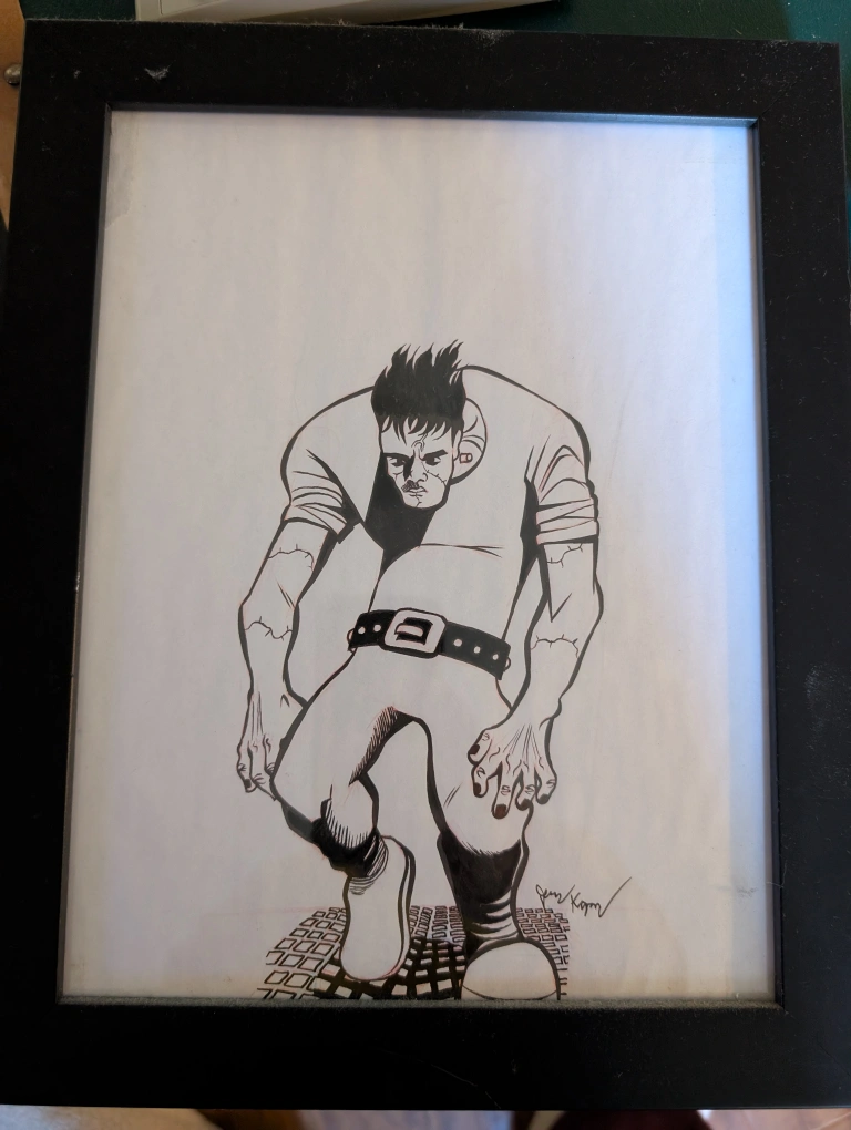 Original framed ink drawing. Black and white illustration. Features a stylized Frankenstein's monster. Artist signature in bottom right corner.