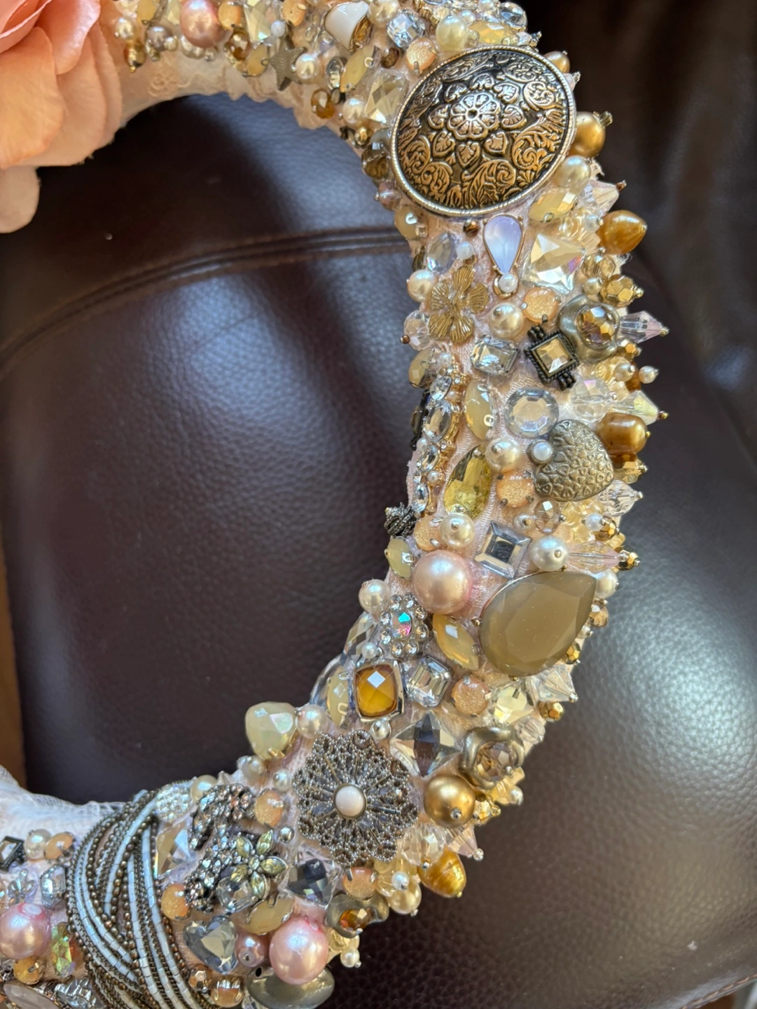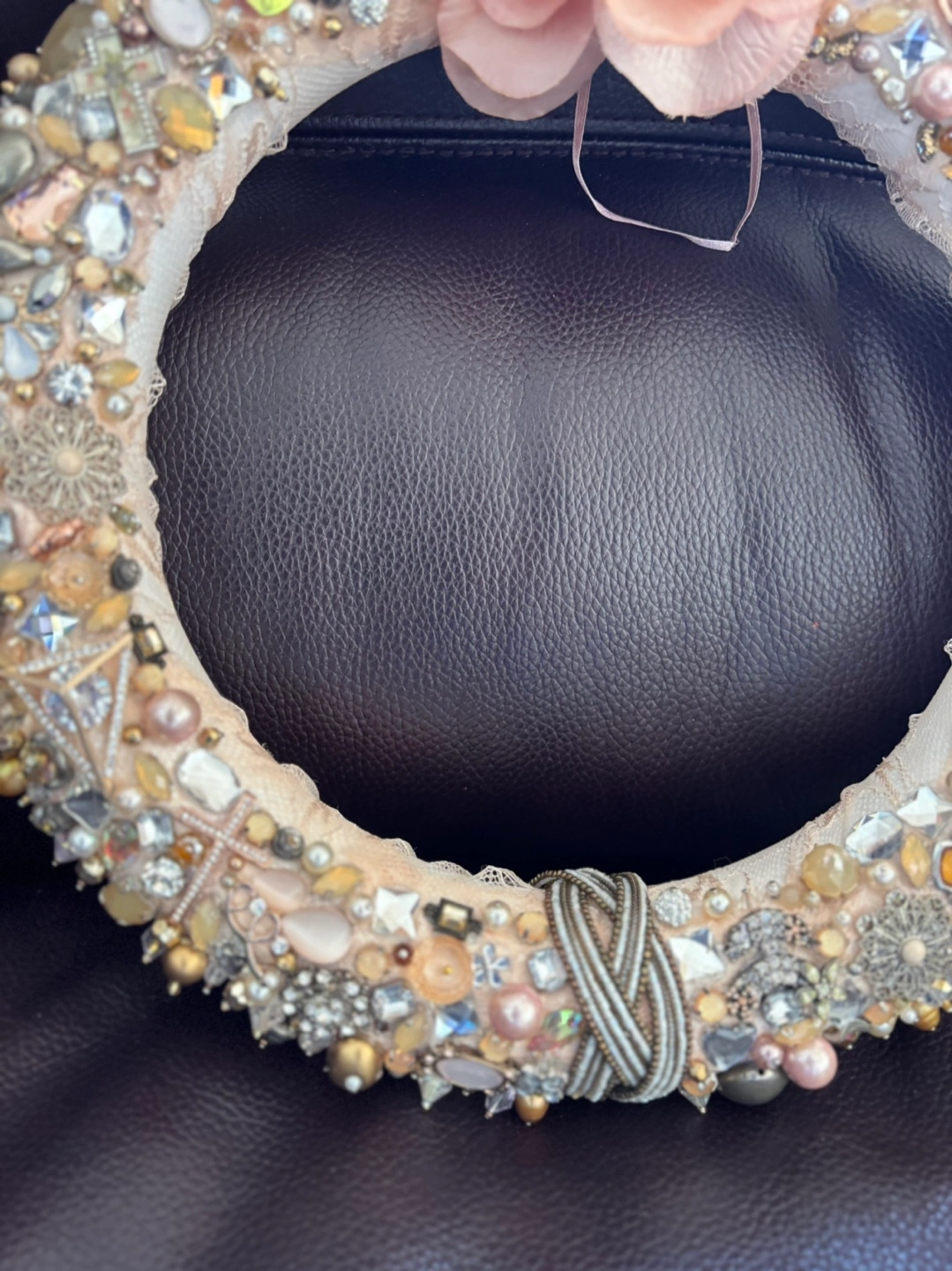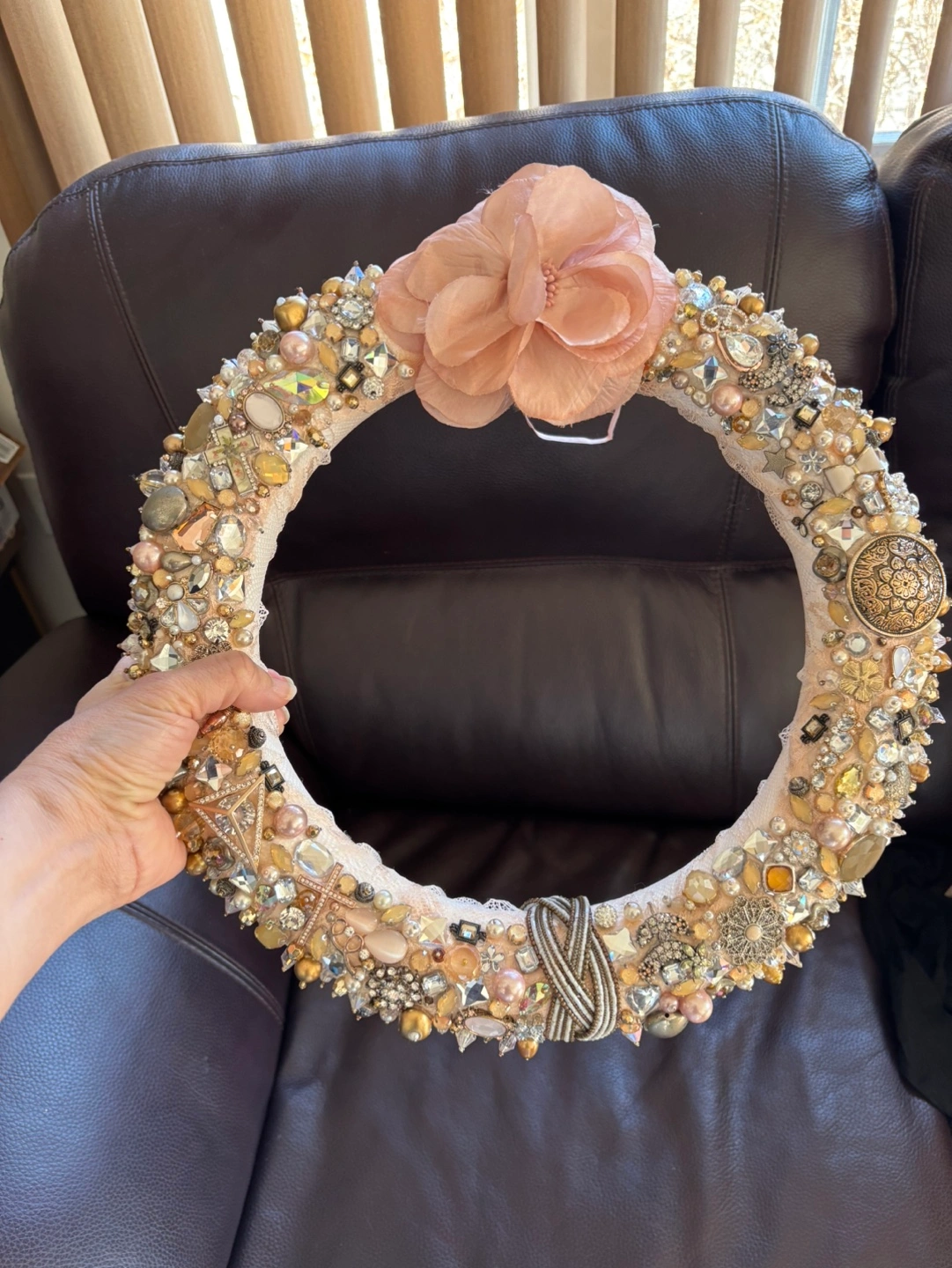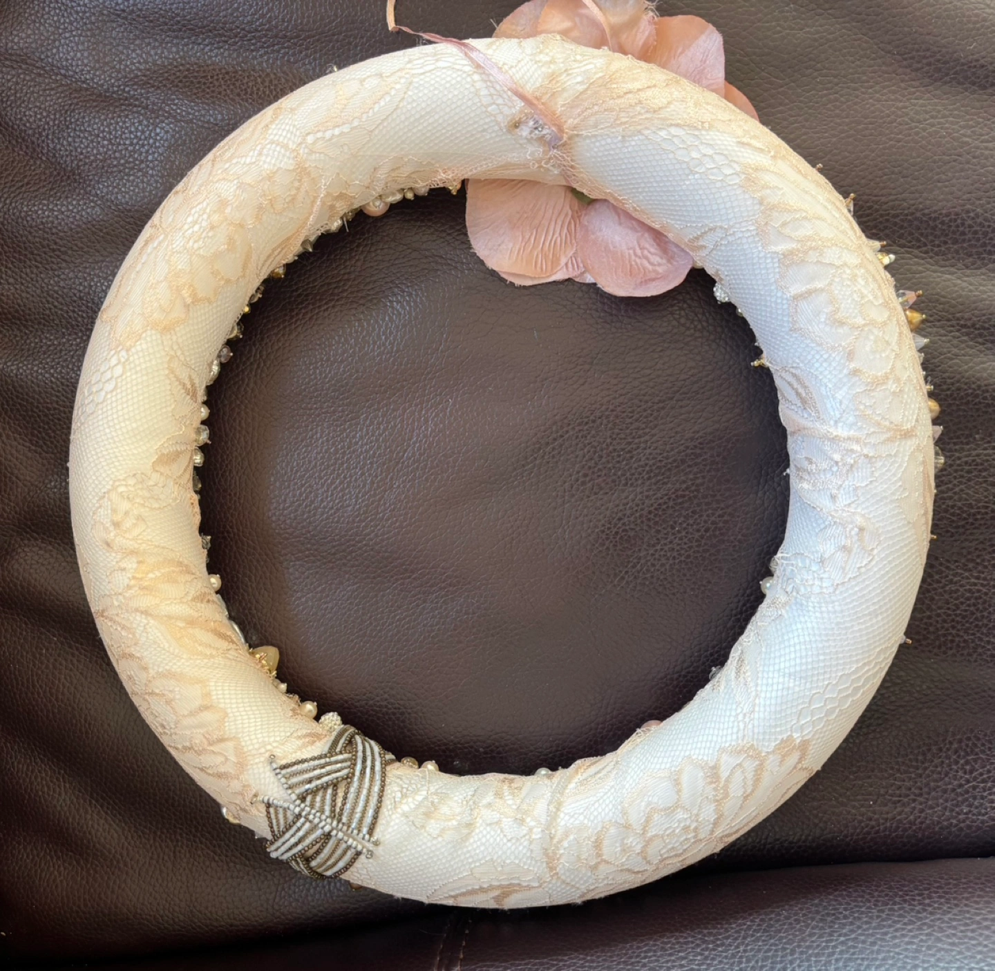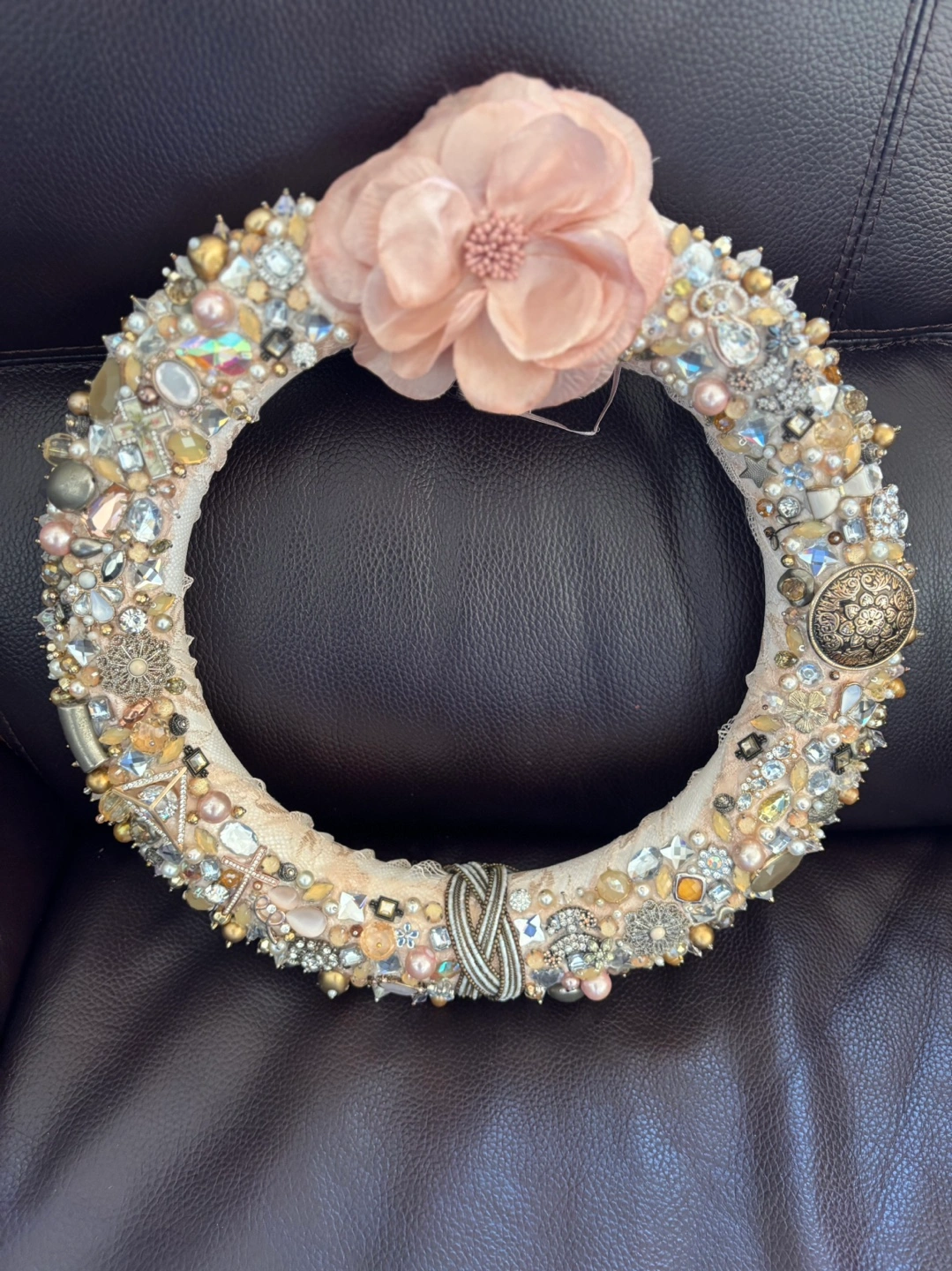 Beautiful handmade wreath. Features various beads, jewels, and a fabric flower. Neutral colours. Perfect for home decor or wedding decor or a gift. Size: 14” Pickup in Mississauga only with cash , no holds