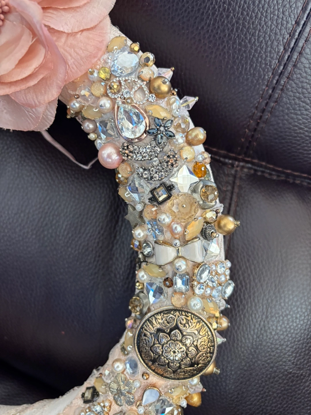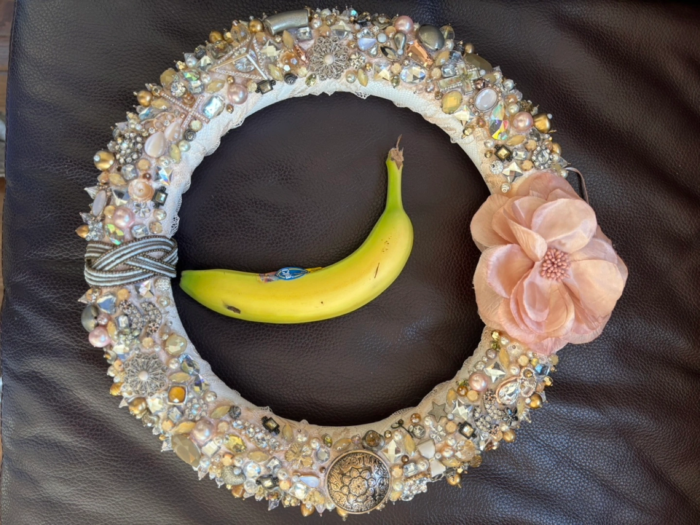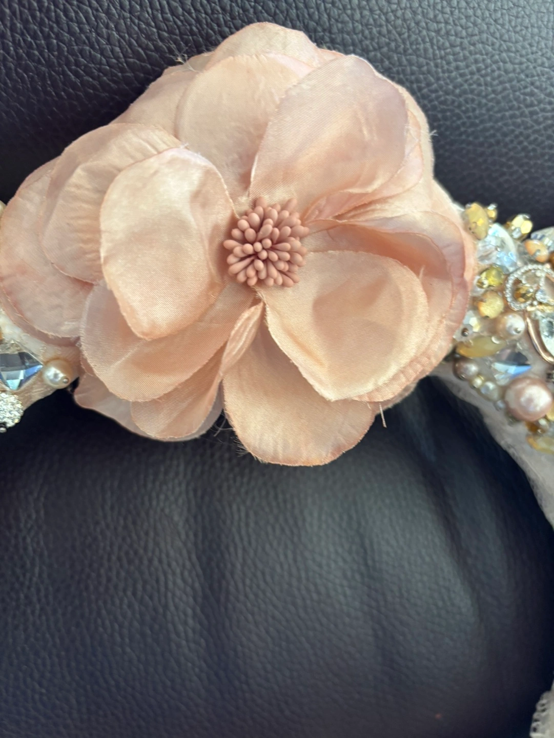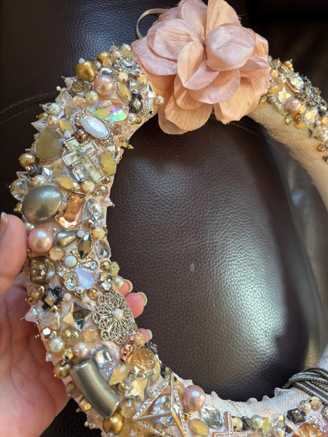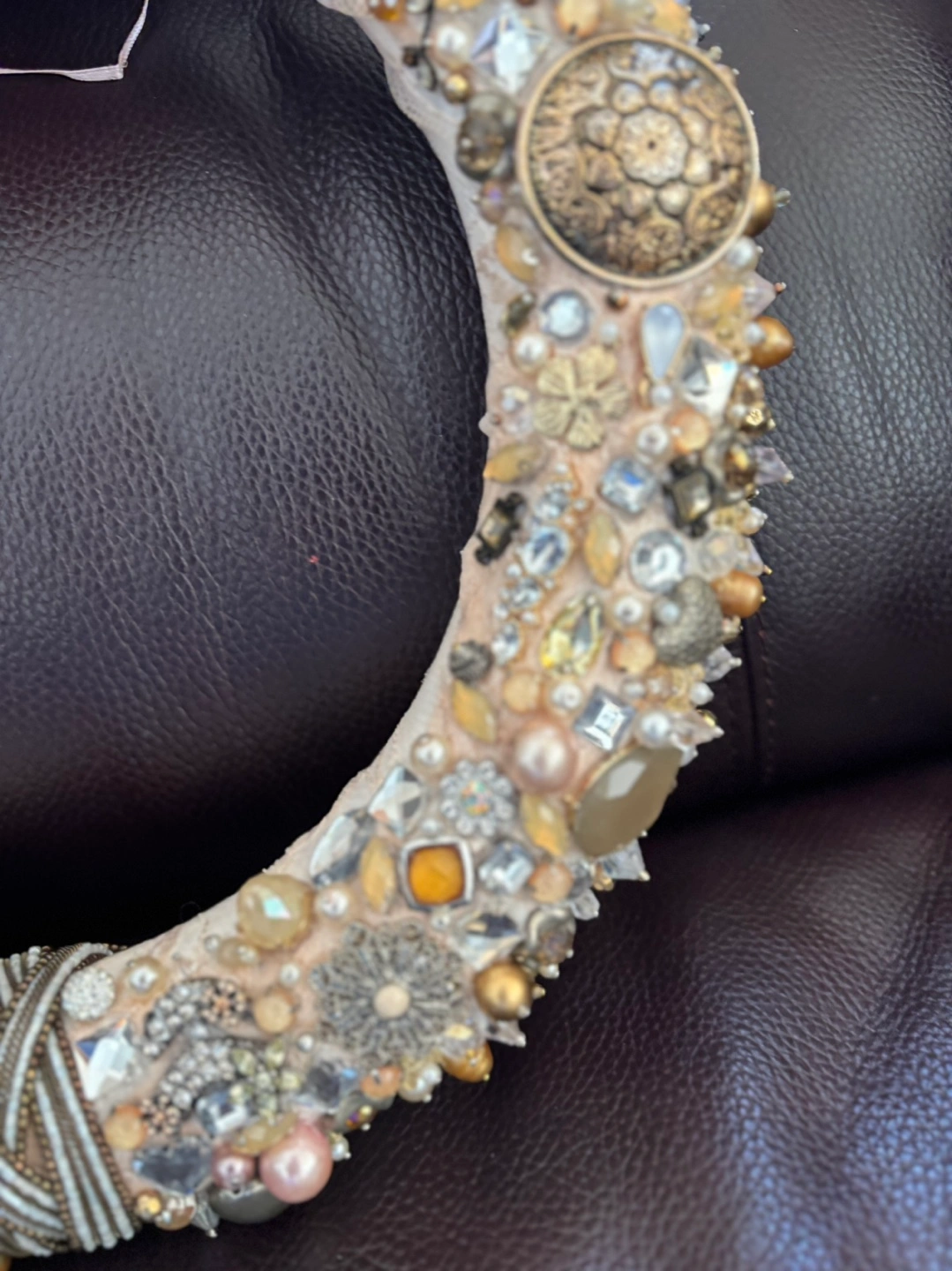 Beautiful handmade wreath. Features various beads, jewels, and a fabric flower. Neutral colours. Perfect for home decor or wedding decor or a gift. Size: 14” Pickup in Mississauga only with cash , no holds