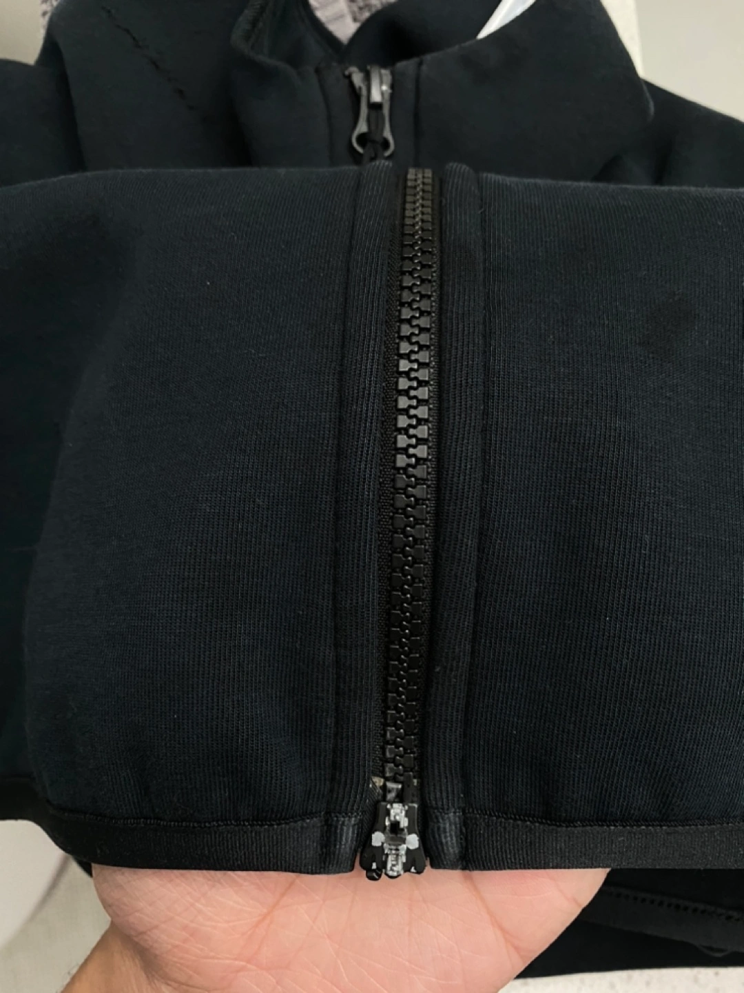 Men's black Nike Tech Fleece zip-up hoodie. Full-zip closure. Small pulls and wear on fabric. Good used condition. Has minor damages