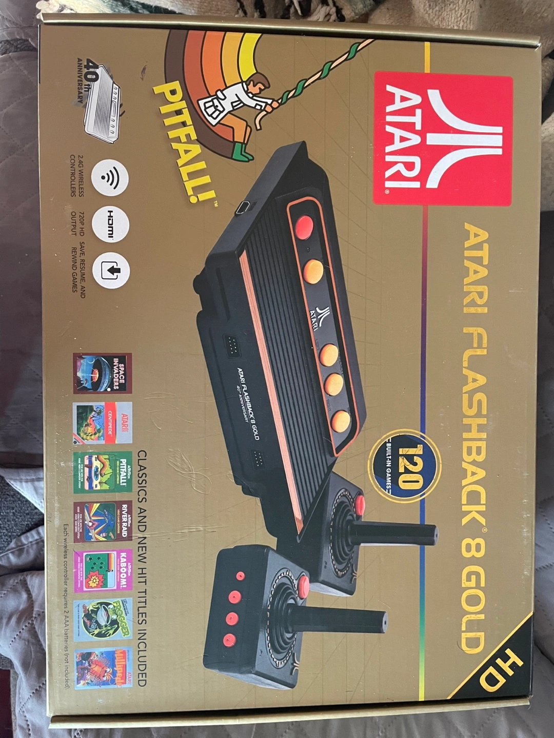 Atari Flashback 8 Gold console. 120 built-in games. Includes two wireless controllers. HDMI output. Save, resume, and rewind game features. Brand new, still in box.