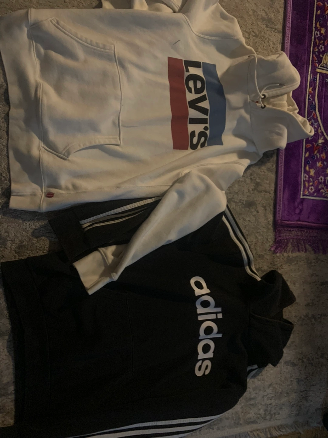 Bundle of three hoodies. Metalica graphic hoodie, black. Adidas black hoodie with white stripes and logo. Levi's cream coloured hoodie with logo. Great for layering or casual wear.