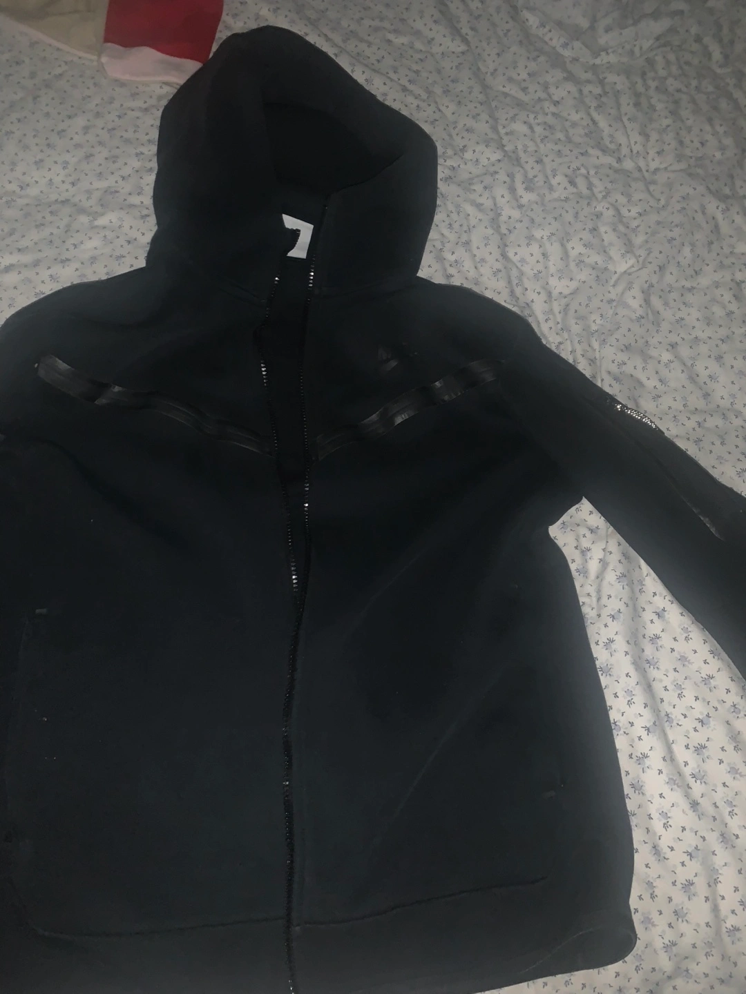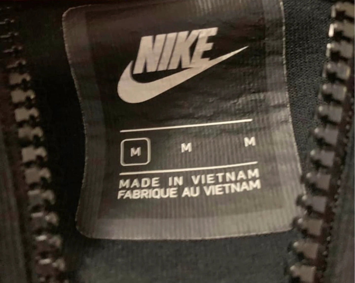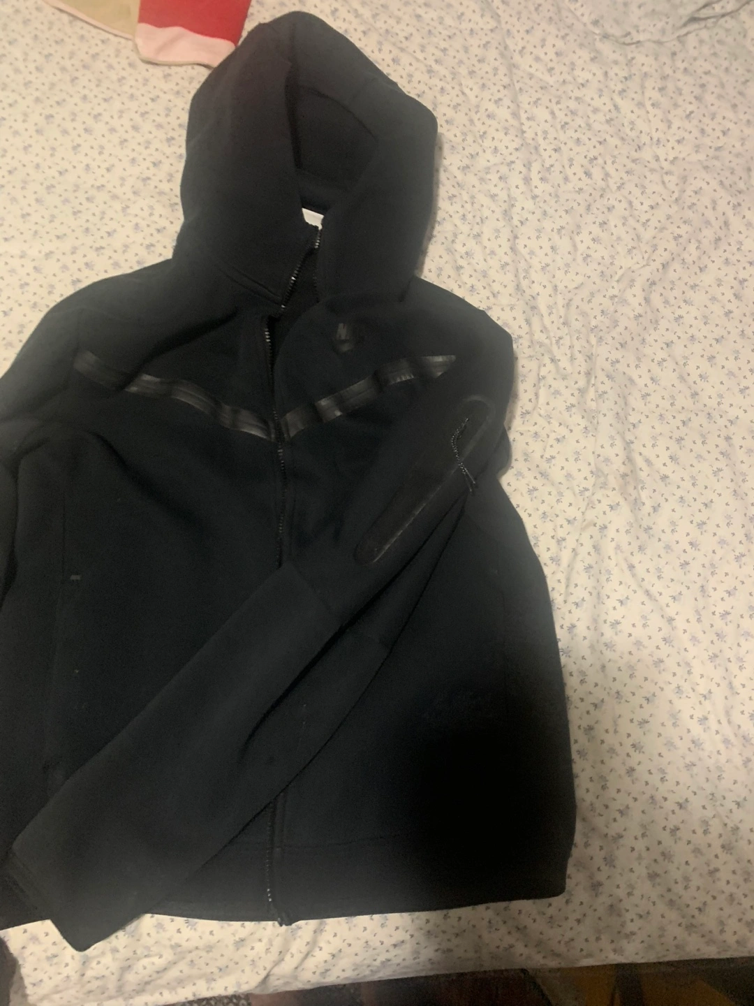 Men's Nike zip-up hoodie. Size medium. Black colour. Features a hood and zipper closure. Made in Vietnam. The zipper broke off and I don’t know how to fix it