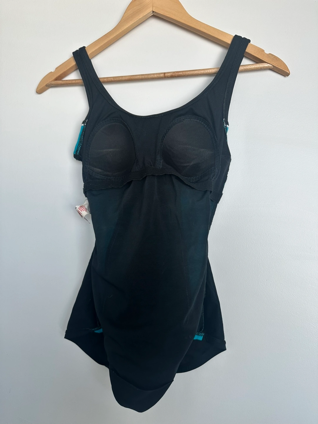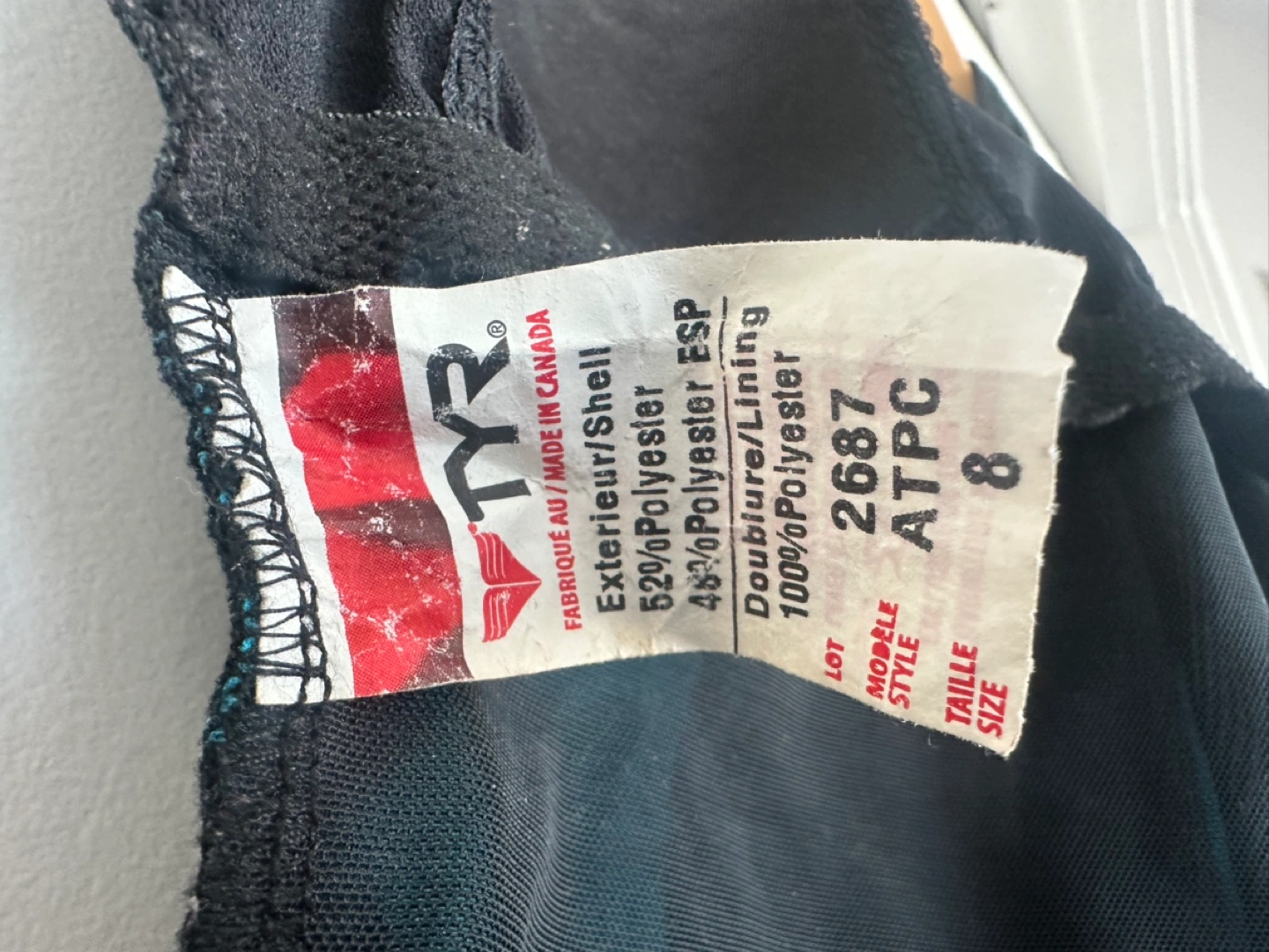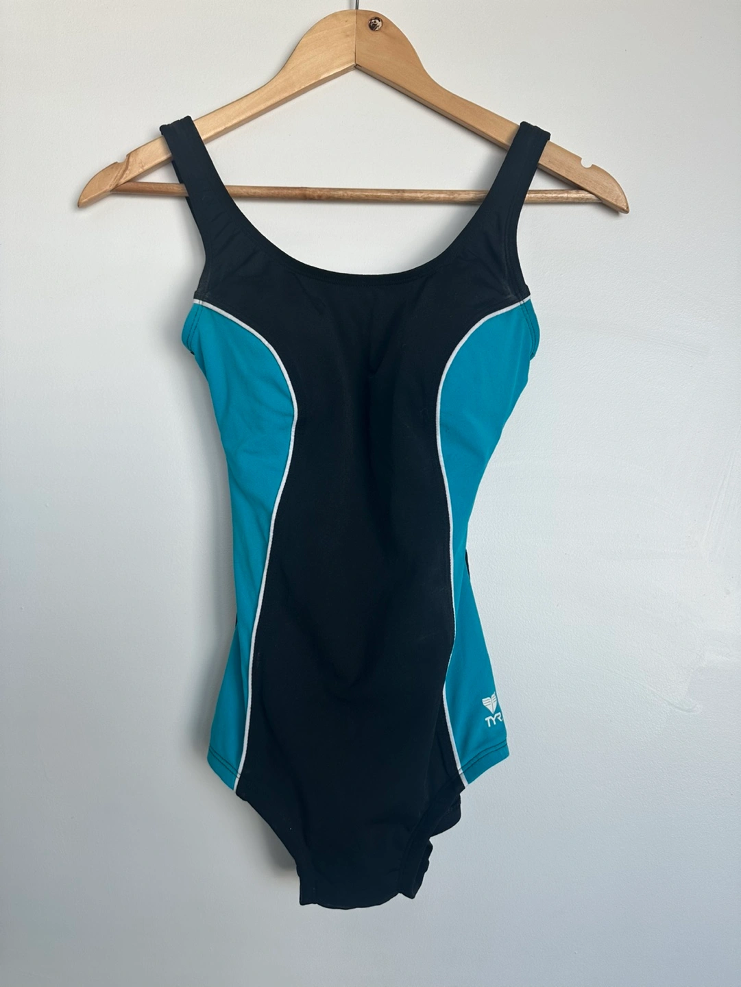 Women's size 8 TYR one-piece swimsuit. Black and teal colour scheme. Built-in bra support. Good condition. Once worn at shop. Never been worn in a pool swimming.