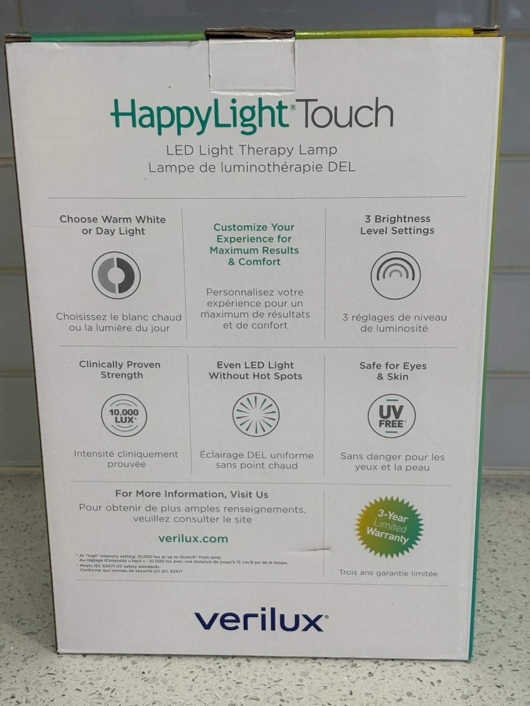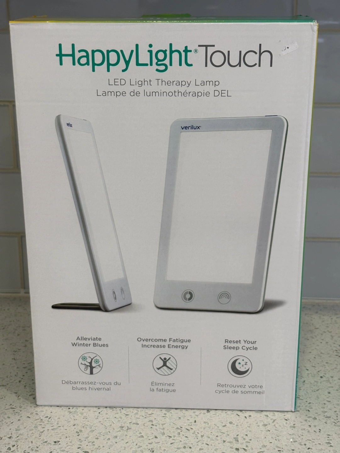 Verilux HappyLight Luxe LED Therapy Lamp VT32 *NEW IN BOX* - complete - $35 *NEW IN BOX* - missing stand - $30 Dimensions: 1.3D x 16.2W x 26.2H CM Item weight: 1.8 Pounds Lamp type: Light Emitting Diode Shade colour: White Switch type: Touch UV-FREE, LED, FULL SPECTRUM LIGHT - Light therapy lamp that delivers up to 10,000 lux for effective, safe, and natural light therapy PERSONALIZED SETTINGS - Customize your experience with 3 brightness levels, 2 HappyHue color temperature options for maximum comfort IMPROVE SLEEP, MOOD, FOCUS, ENERGY - Bright light therapy improves sleep, boosts mood, increases energy, and enhances focus, leaving you feeling revitalized PORTABLE & PRACTICAL - The ultra-thin tablet design with detachable stand and wall mount makes HappyLight Touch portable enough for use at home or on-the-go, and perfect for the winter blues, insomnia, sunlight deprivation, shift work, office employees, and seniors