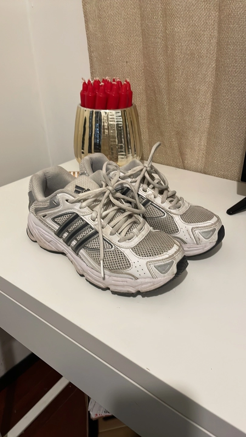 Lightly used Adidas running shoes. Grey and white colour scheme. Mesh upper. Good for casual wear or light exercise. Some wear and tear on soles.
