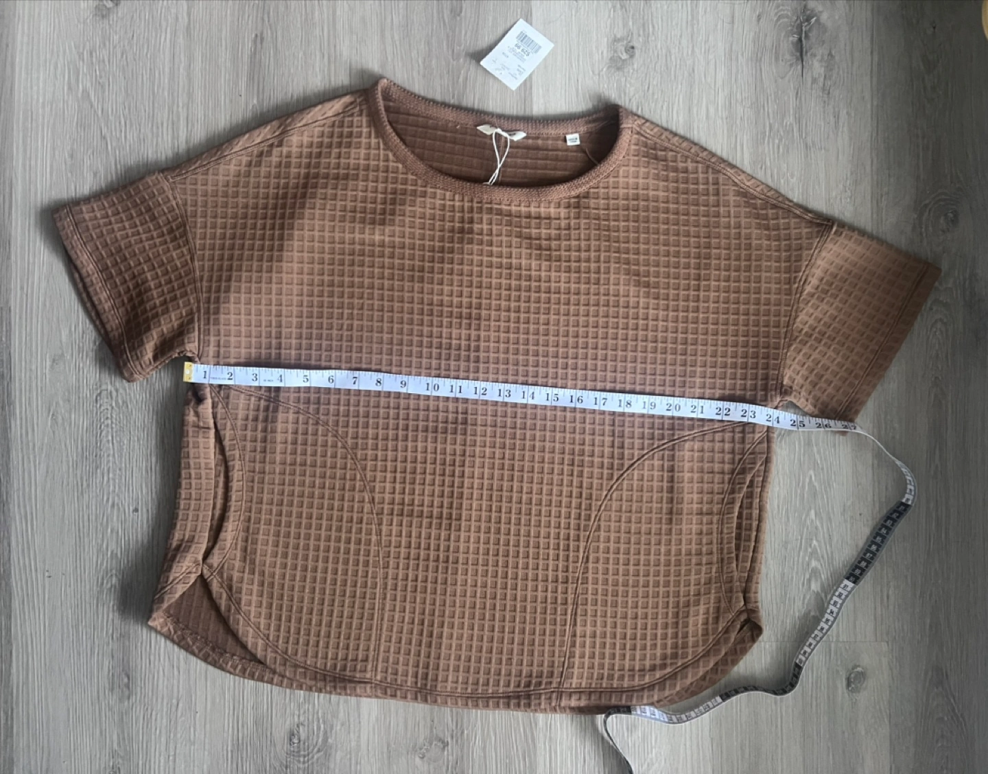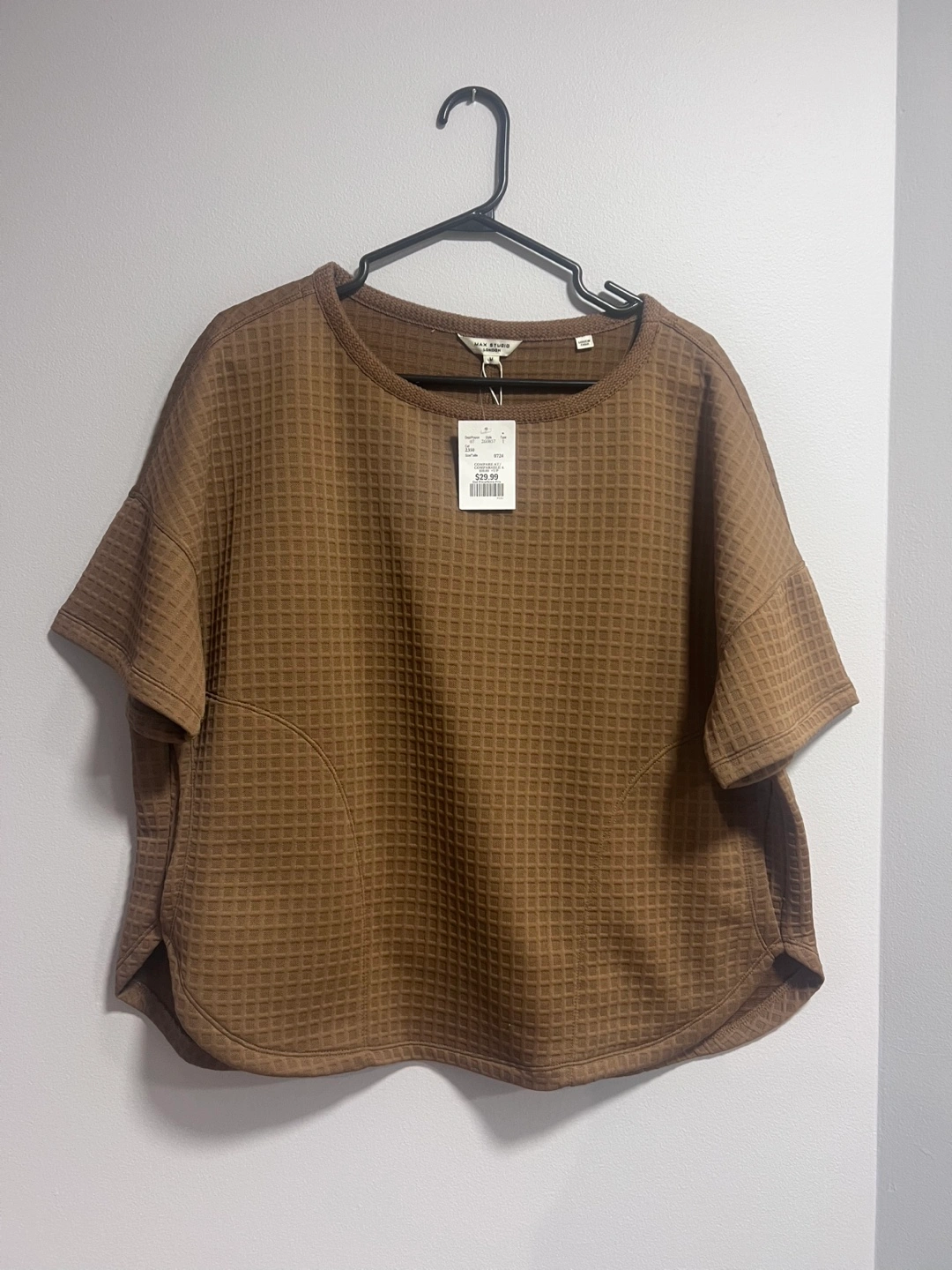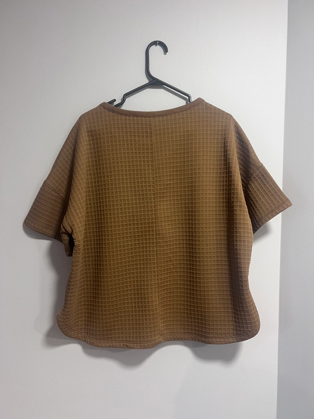 Brown waffle knit cropped top. Short sleeves. Relaxed fit. Size medium. Side pockets. New with tags.