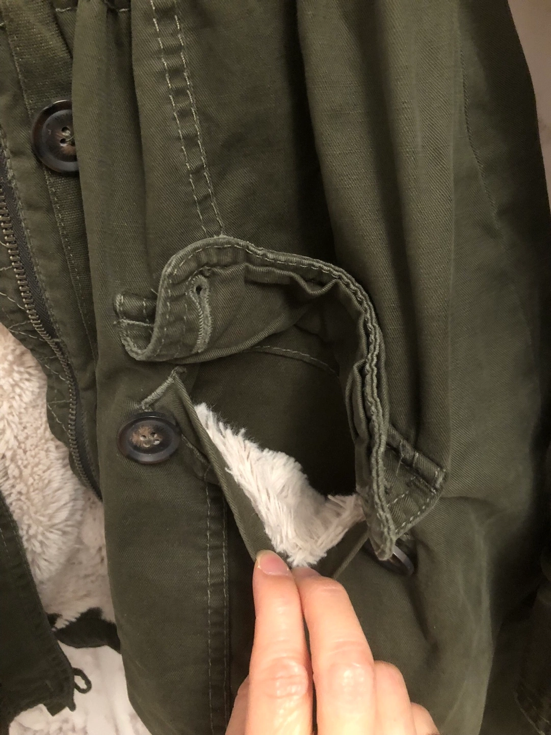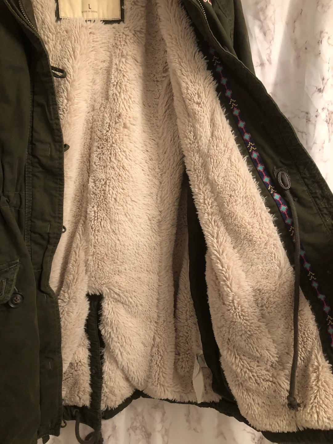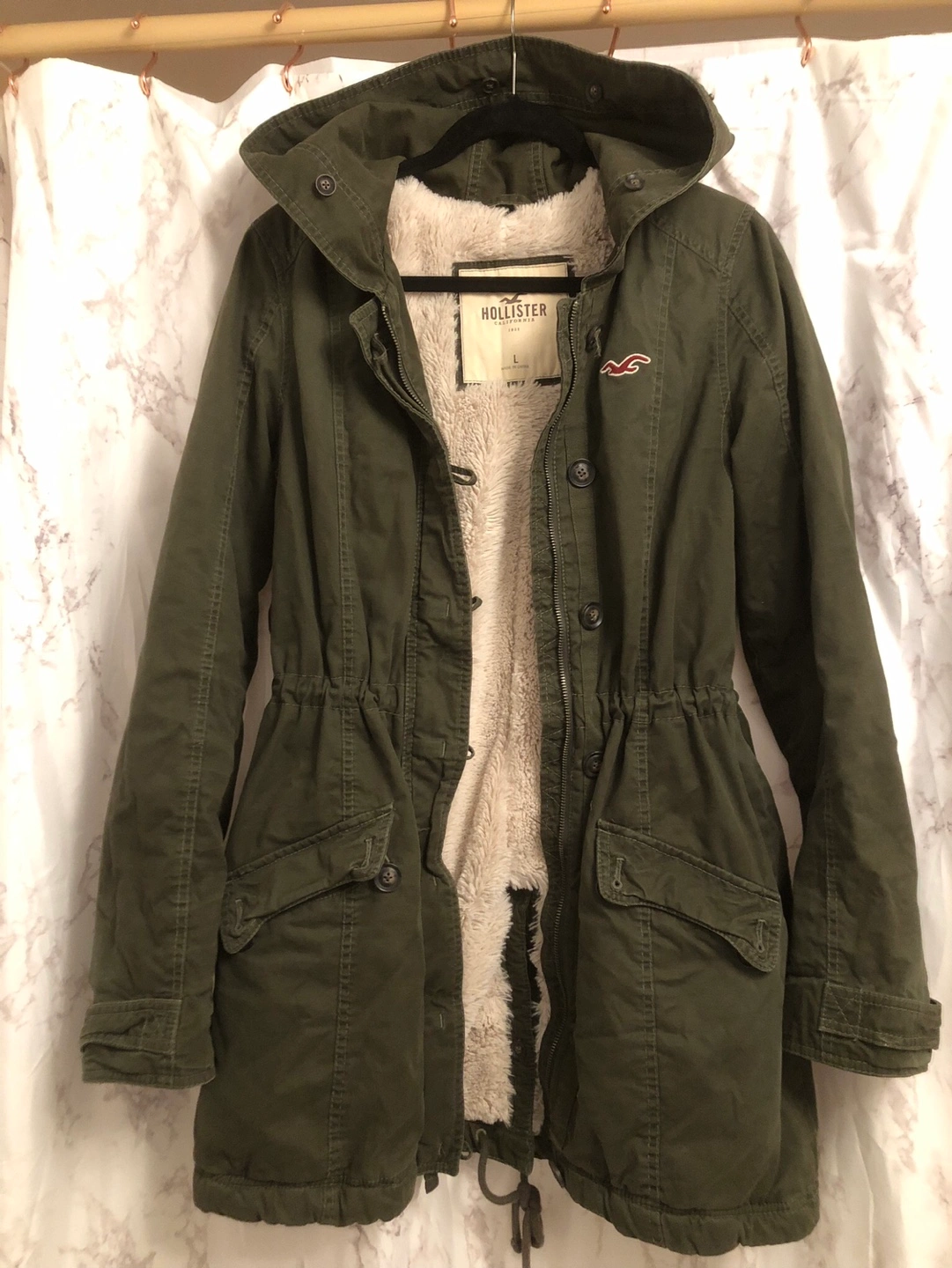 Women's olive green parka. Features a sherpa lining, drawstring waist, and multiple pockets. Size Large. Good condition