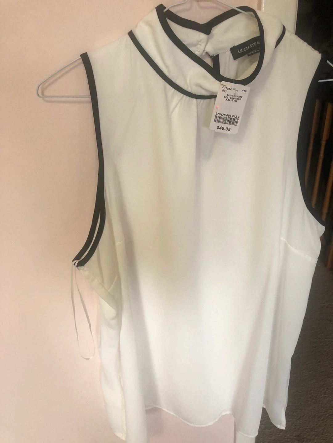 Elegant sleeveless blouse. Off-white colour. Features a mock neck and black trim. Size XL.