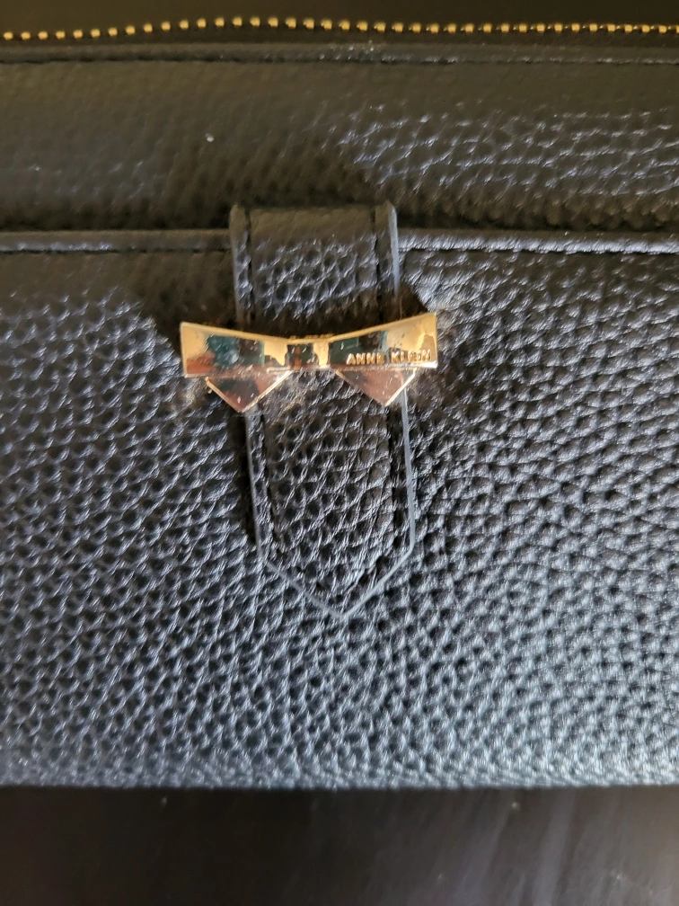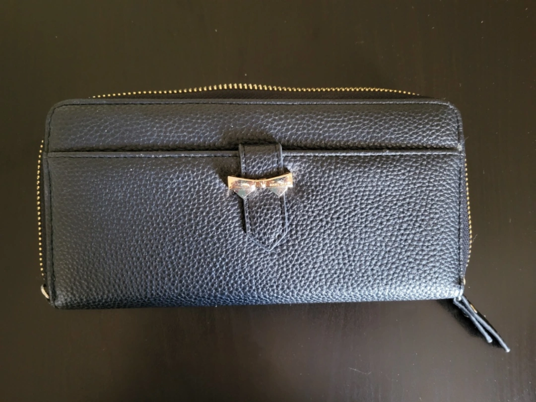Long black wallet. Features a zip closure, multiple card slots, and a zip coin pouch. Gold-toned hardware. Excellent condition.