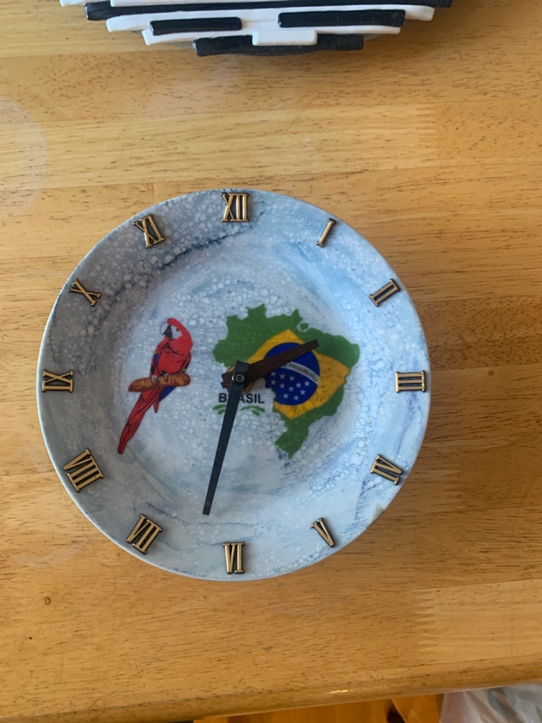 Unique wall clock. Features a map of Brazil and a parrot. Roman numerals. Looks great on any wall and for who love collecting clocks.