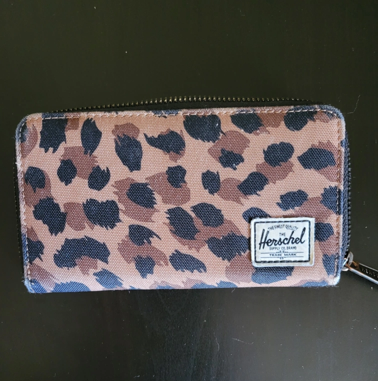 Women's compact wallet. Leopard print design. Zipper closure. Multiple card slots and compartments. Coin pocket and zipper. Black interior.
