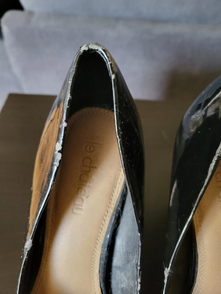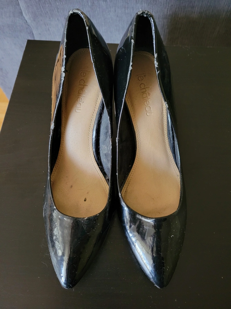 Pair of black patent leather heels. Pointed toe. Wear and tear visible but still a good shoe option for a long dress or gown. Size 8 women's.