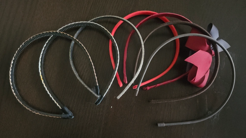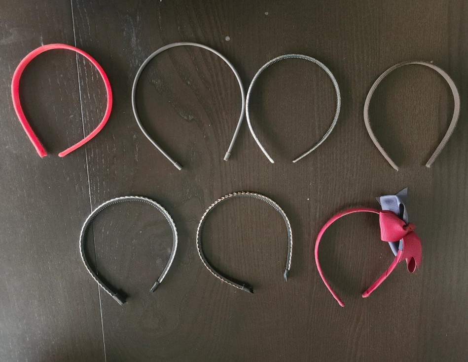 Seven assorted headbands, in red, brown, and metallic colours. The silver and bronze braided ones are a little worse for wear but still fine. Pick up only :)