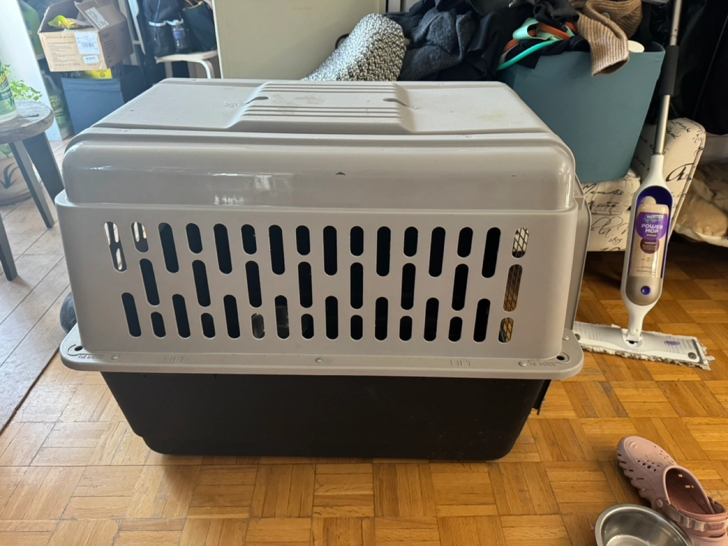 Fits my 3 small dogs Grey and black plastic pet carrier. Features ventilation holes and a sturdy design. Ideal for transporting small to medium-sized pets.
