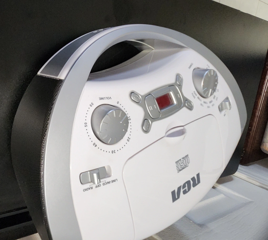 Portable CD player. Plays CDs. AM/FM radio. Built-in handle. Good condition. CD section doesn't work but radio works well cord missing.