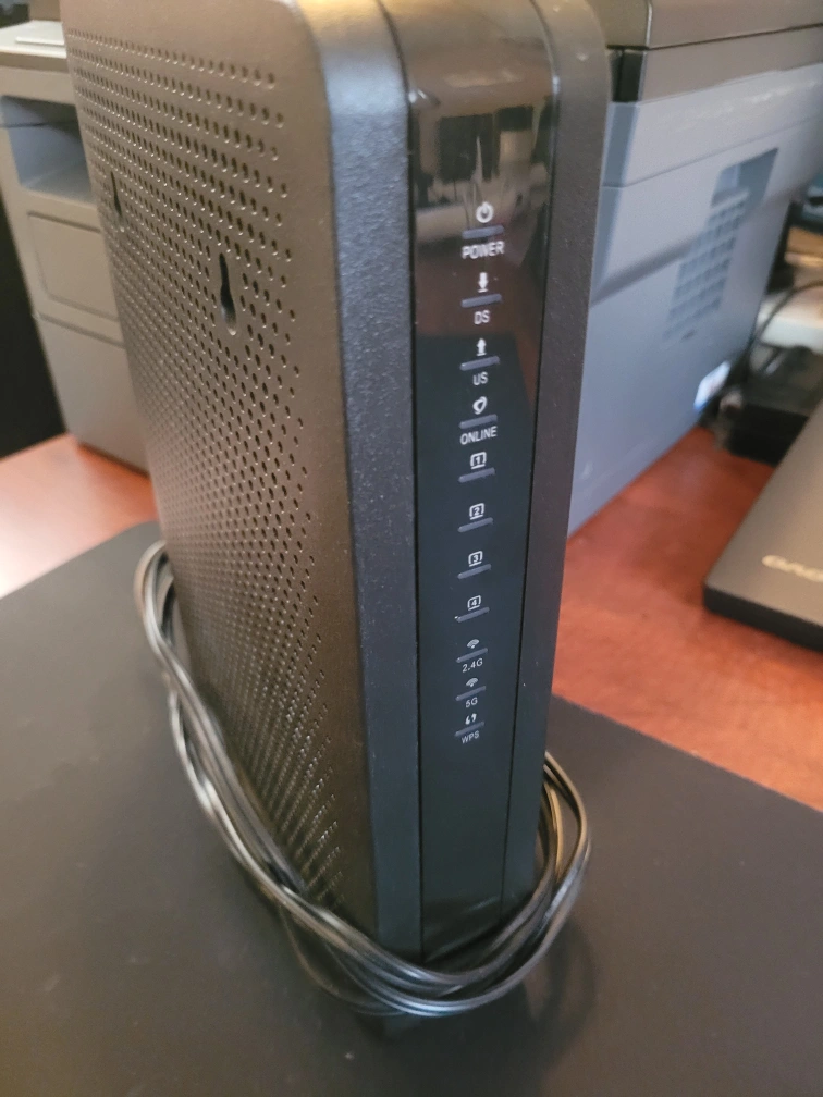 Used Technicolor DPC3848V modem. Includes power cord. Features multiple Ethernet ports and coaxial connection. 2.4G and 5G Wi-Fi. sitting in a cupboard for a while. Still working fine. Factory reseted. Not assigned to telus, rogers, tech-savvy or other providers. used for cable, fiber internet power cable provided. Can add more cables if desired.
