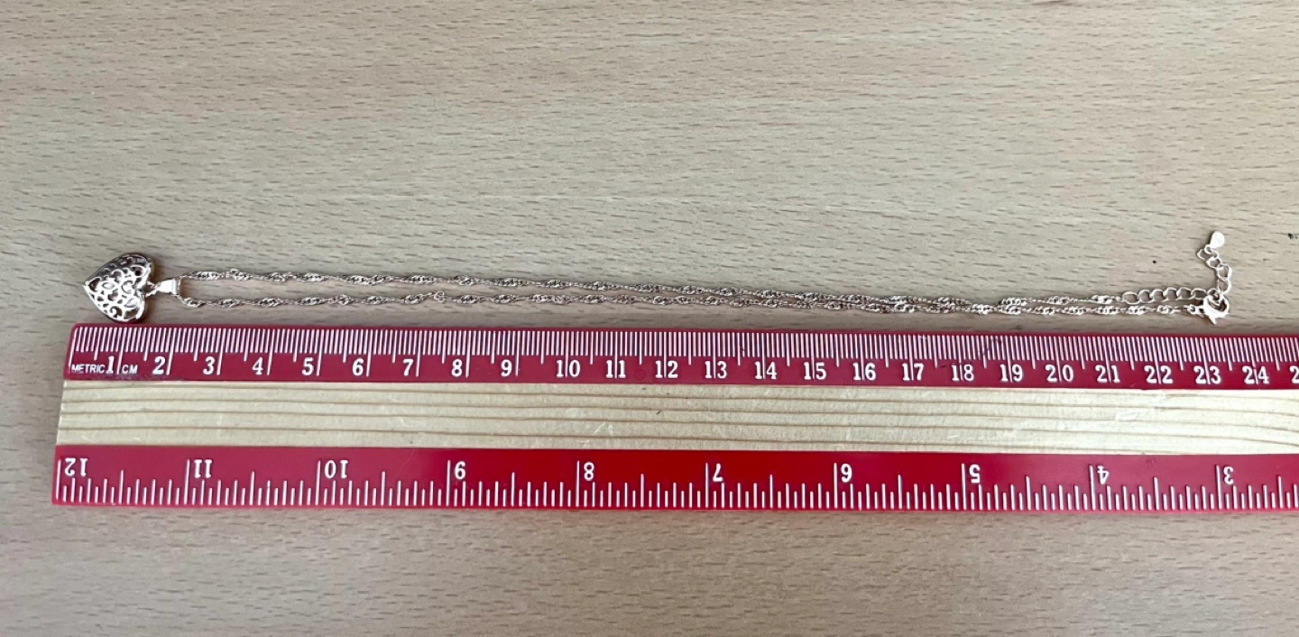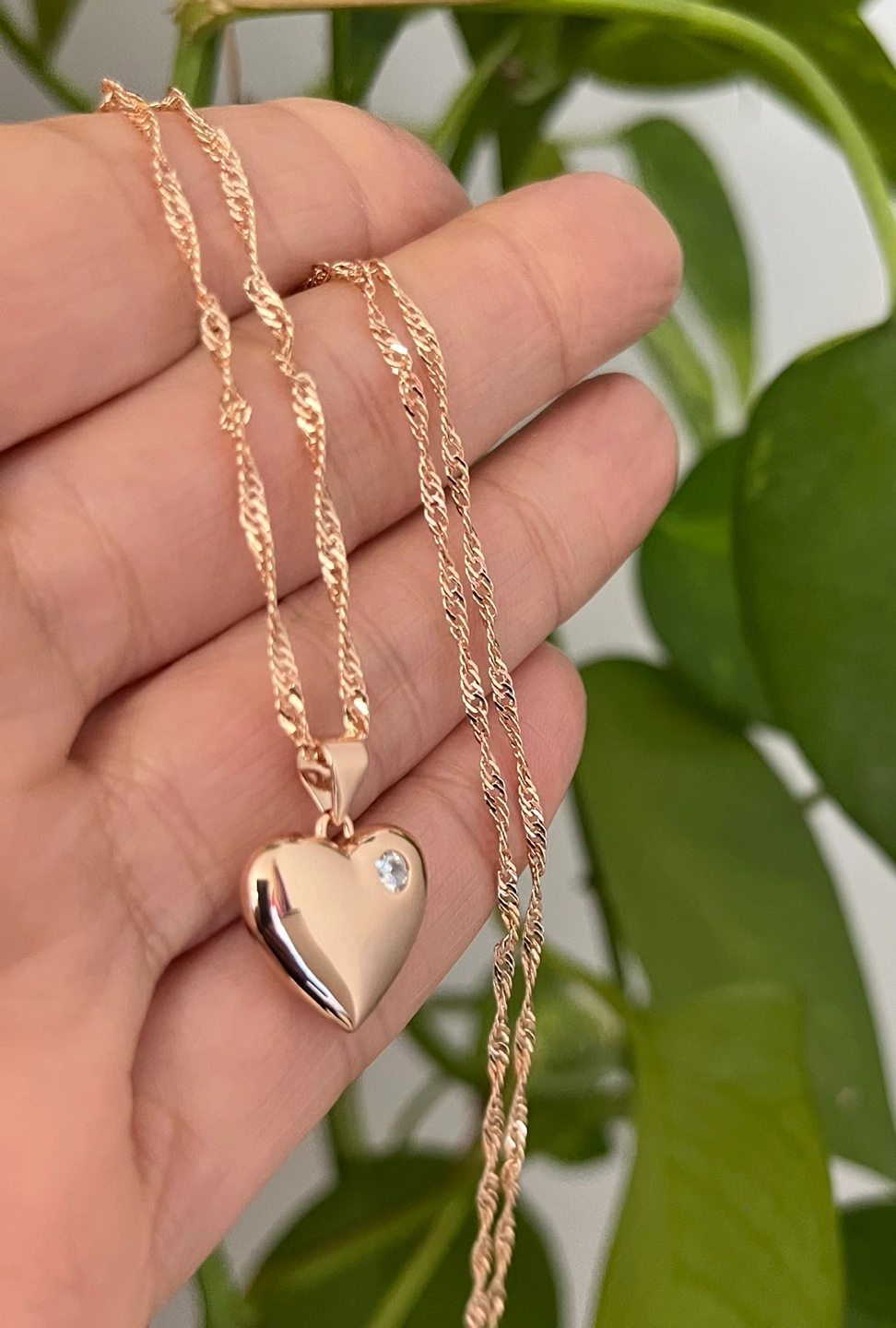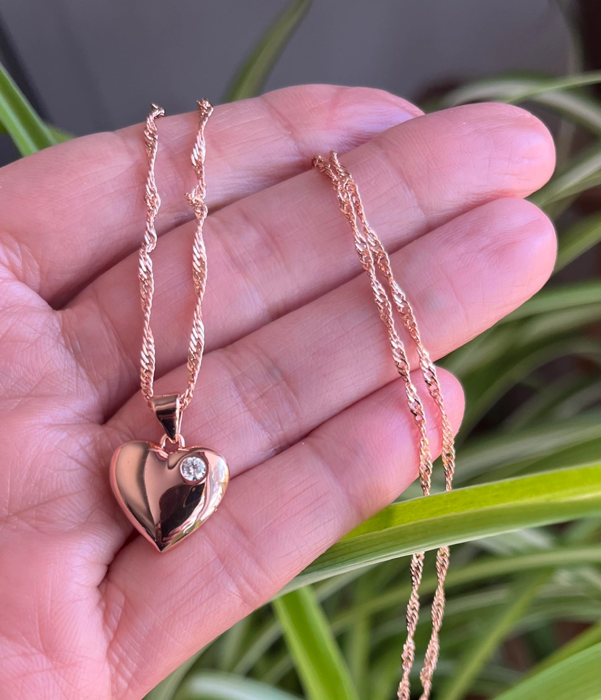 Delicate rose gold necklace. Features a heart-shaped pendant. Pendant has intricate detailing and is reversible . Includes a twisted chain. Approximately 23 inches long.
