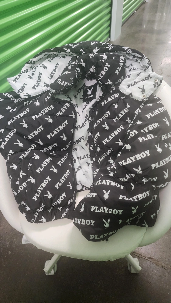 Black and white puffer jacket. All-over Playboy bunny and logo print. Size small. Features a hood.