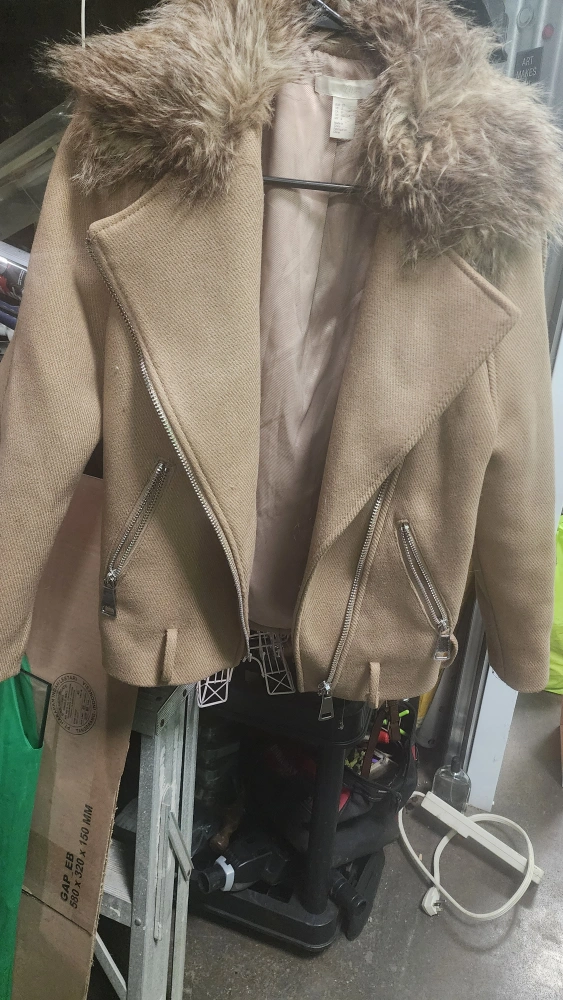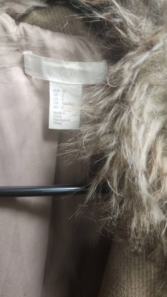 Tan coloured jacket. Features a faux fur collar and zipper closure. Size EUR 32. Made in China.
