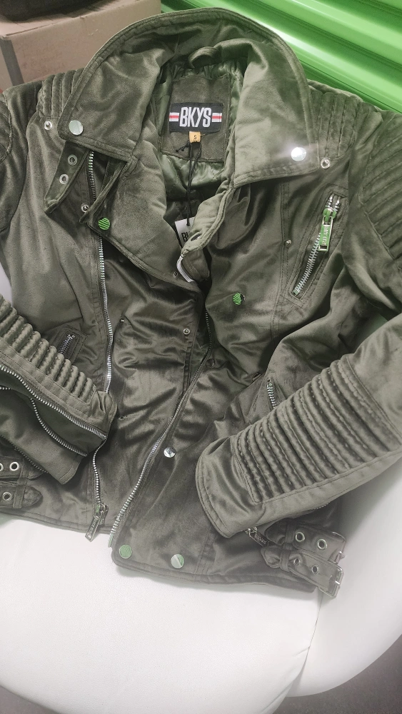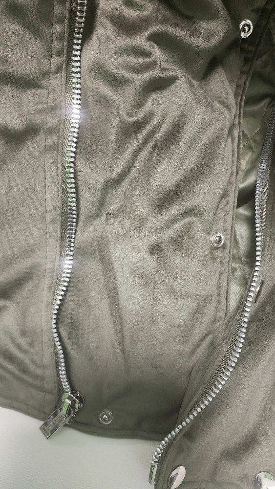 Women's olive green jacket. Suede-look material. Zipper and snap closures. Multiple pockets. Lightly quilted lining. Size small.One missing snap.