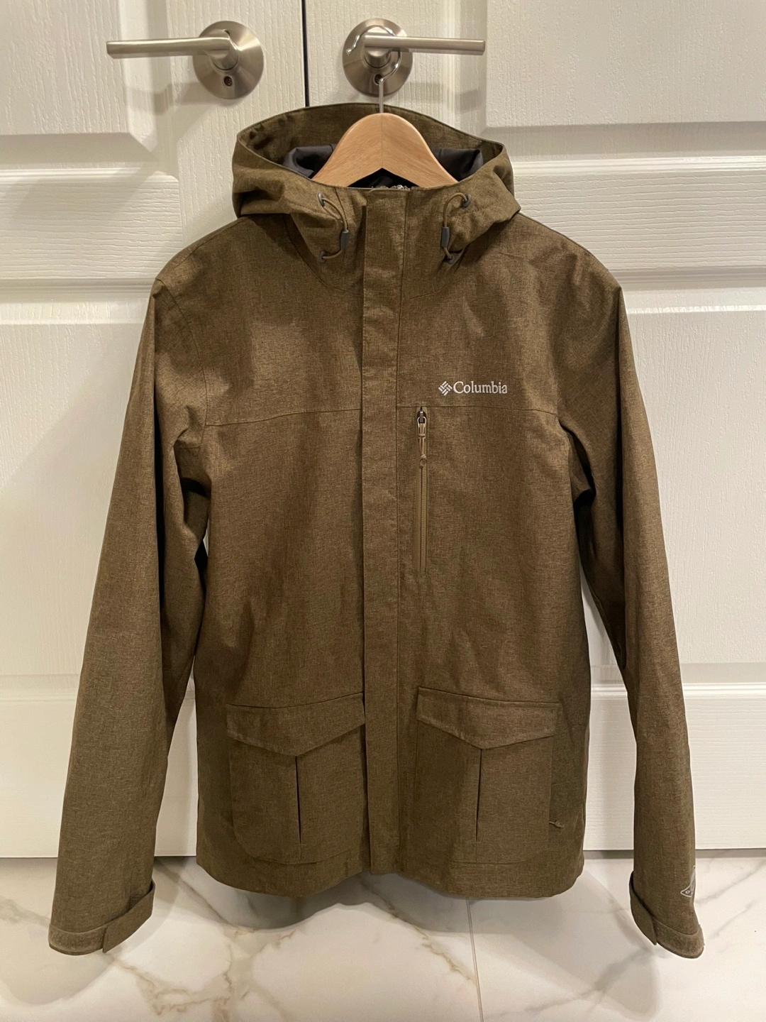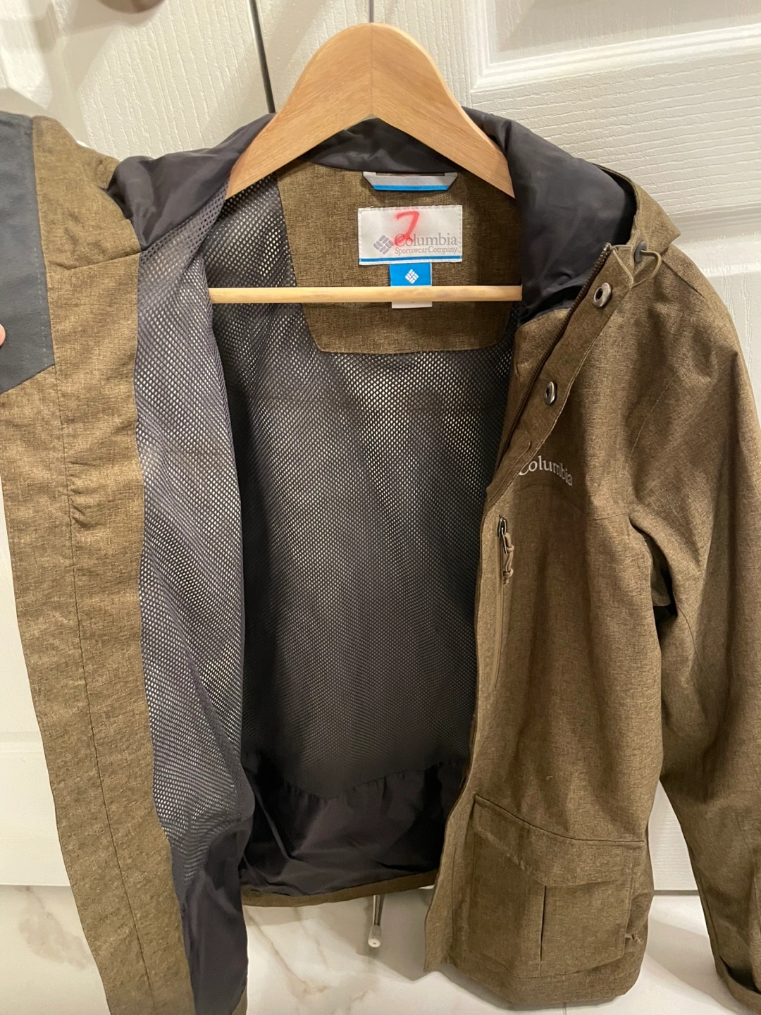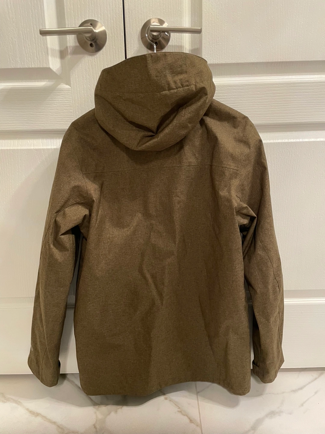 Olive green colour. Features a hood and zipper closure. Mesh lining. Good for colder weather.