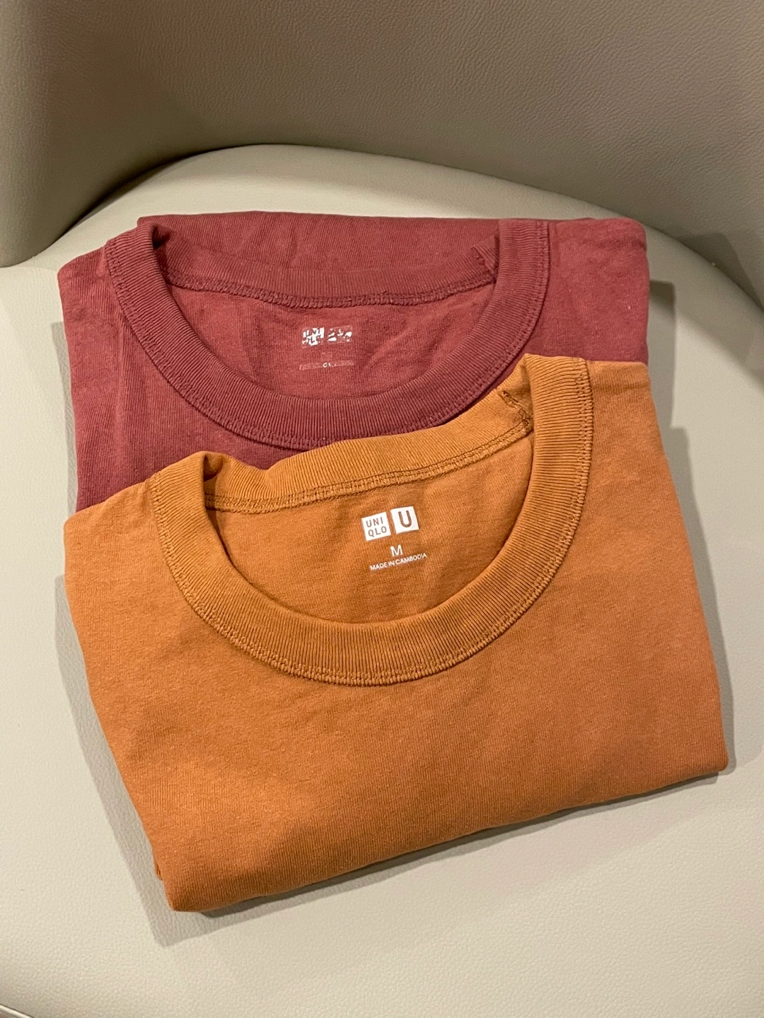 Bundle of two UNIQLO U crew neck t-shirts. One maroon, one burnt orange. Size M. Maroon was used 2-3 times, tag just washes off easily. Orange is brand new. Link for fit: https://www.uniqlo.com/ca/en/products/E422992-000?colorCode=COL09&sizeCode=SMA004