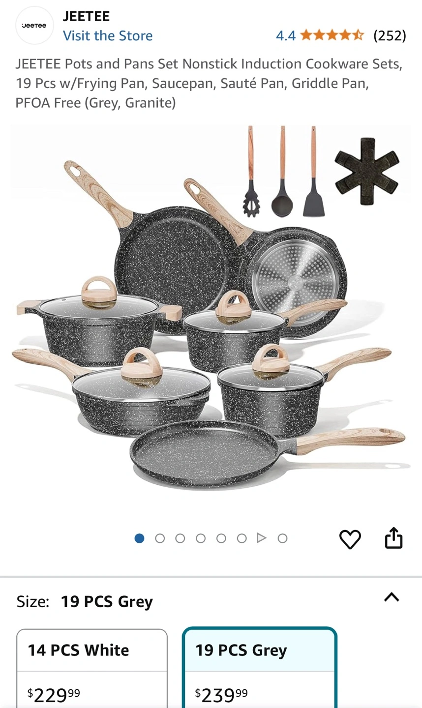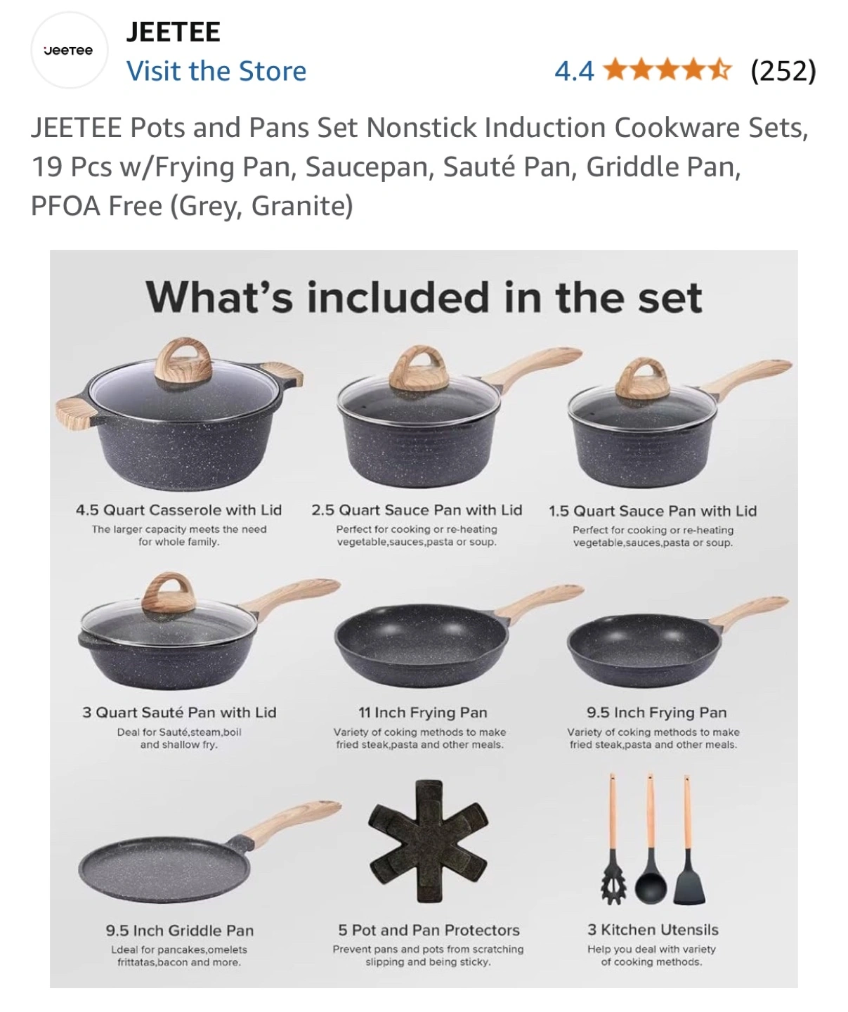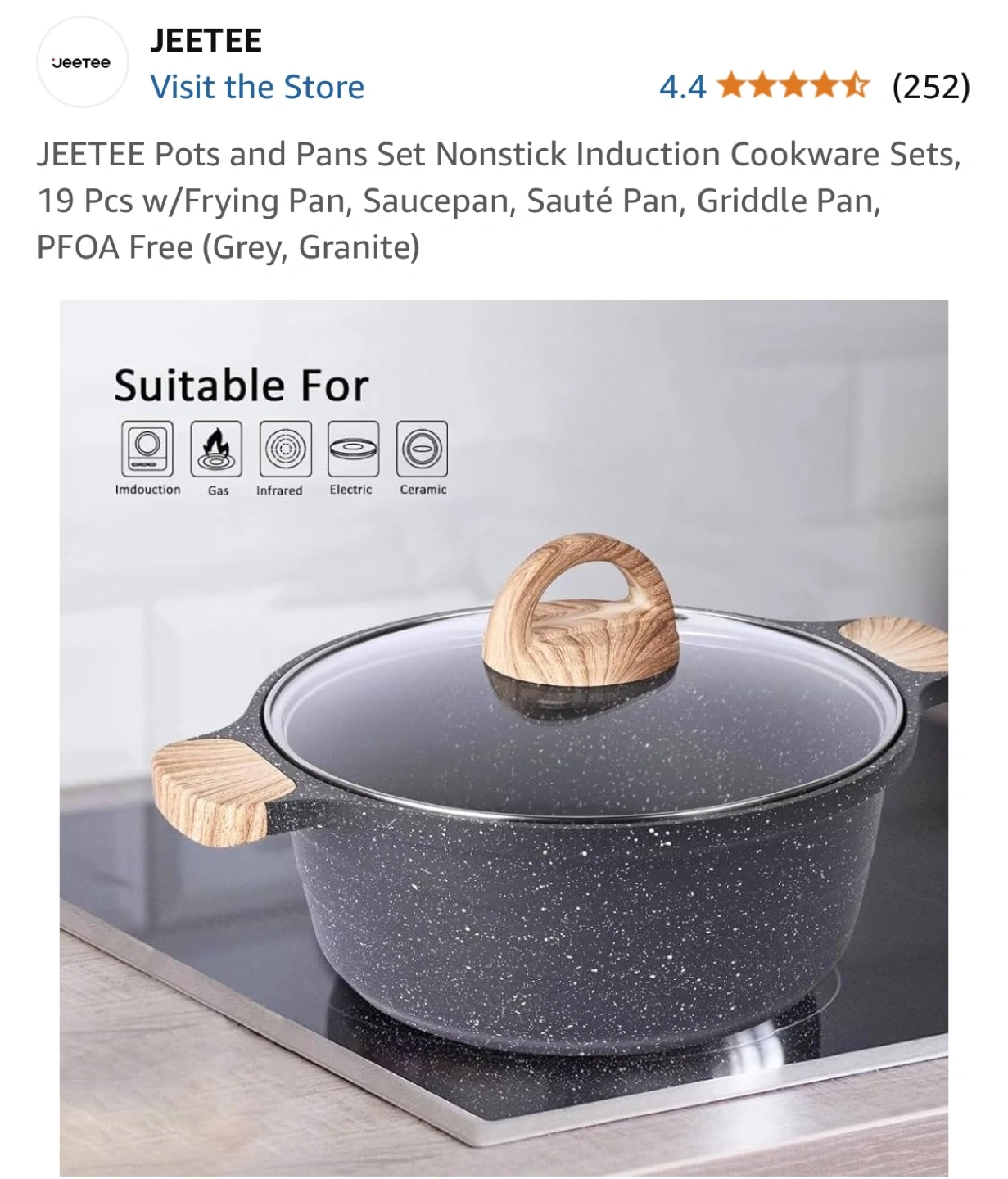 New in Box Material Aluminum Colour Grey Brand JEETEE Size 19 PCS Grey Handle material Bakelite Is dishwasher safe No What's In The Box: 9.5 inch frying pan +11 inch frying pan +1.5 QT saucepan with lid + 1.5 QT saucepan with lid + 3 QT sauté pan with lid + 4.5 QT casserole with lid + 9.5 inch griddle pan + 5 pot and pan protectors + 3 kitchen utensils. Ultra Nonstick Coating: The nonstick granite cookware set is not only robust but also 100% PFOA, lead, and cadmium free. Super Easy to Clean: All-in-one design and nonstick surface prevent our pot set from food sticking problem. Hand wash recommended to protect the coatings. Suitable Stoves: The cooking pan set is compatible for all stoves, including induction, ceramic, gas & electric stove. Cook Great Dishes: Ideal for fried eggs, pancake, omelette, steak, sauce, soup and more with a full non stick pots and pan set for cooking demands.