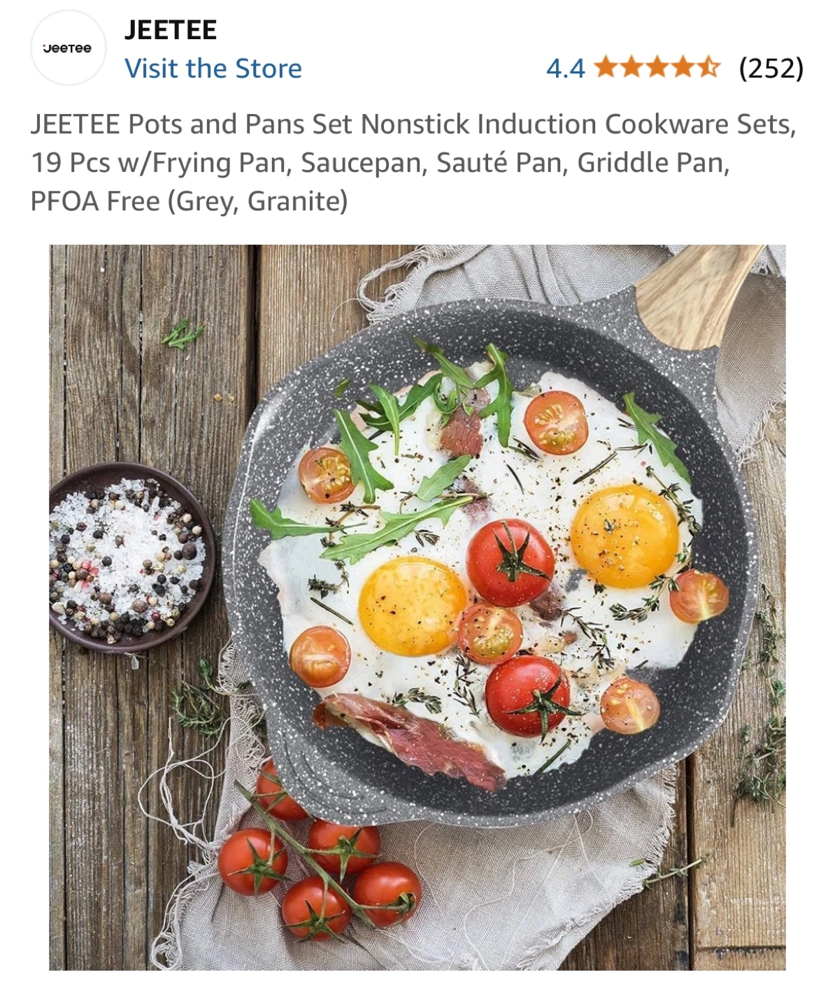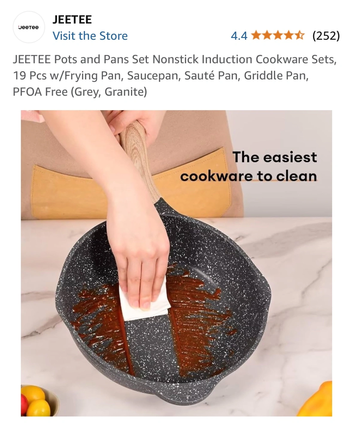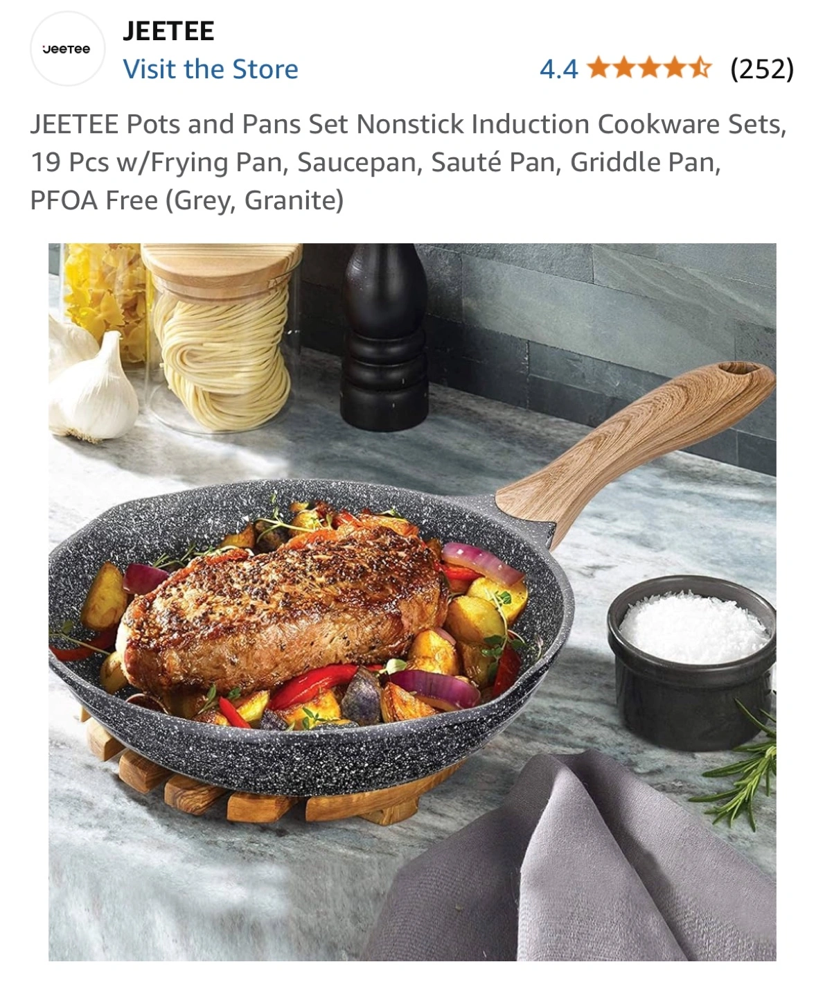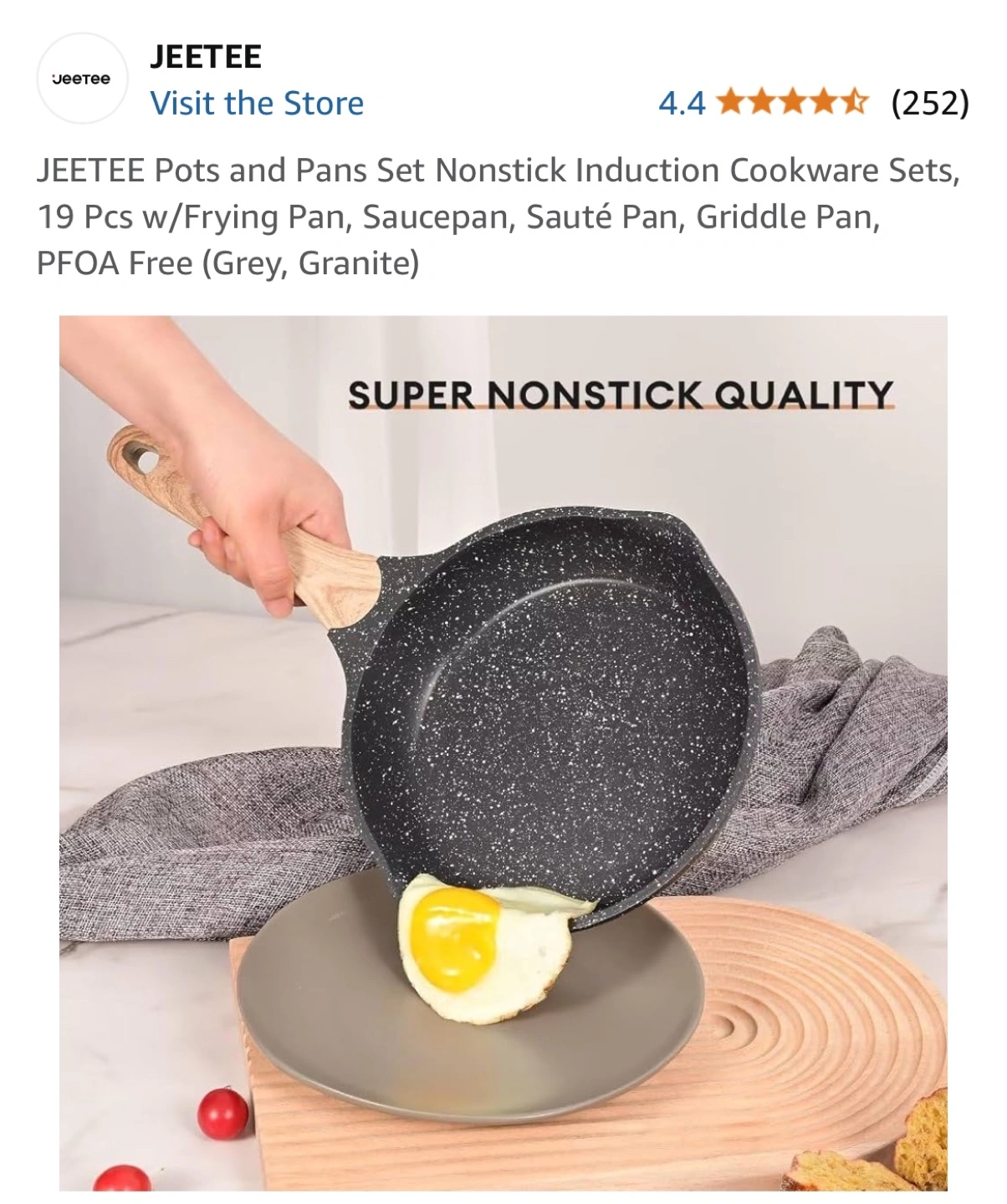 New in Box Material Aluminum Colour Grey Brand JEETEE Size 19 PCS Grey Handle material Bakelite Is dishwasher safe No What's In The Box: 9.5 inch frying pan +11 inch frying pan +1.5 QT saucepan with lid + 1.5 QT saucepan with lid + 3 QT sauté pan with lid + 4.5 QT casserole with lid + 9.5 inch griddle pan + 5 pot and pan protectors + 3 kitchen utensils. Ultra Nonstick Coating: The nonstick granite cookware set is not only robust but also 100% PFOA, lead, and cadmium free. Super Easy to Clean: All-in-one design and nonstick surface prevent our pot set from food sticking problem. Hand wash recommended to protect the coatings. Suitable Stoves: The cooking pan set is compatible for all stoves, including induction, ceramic, gas & electric stove. Cook Great Dishes: Ideal for fried eggs, pancake, omelette, steak, sauce, soup and more with a full non stick pots and pan set for cooking demands.