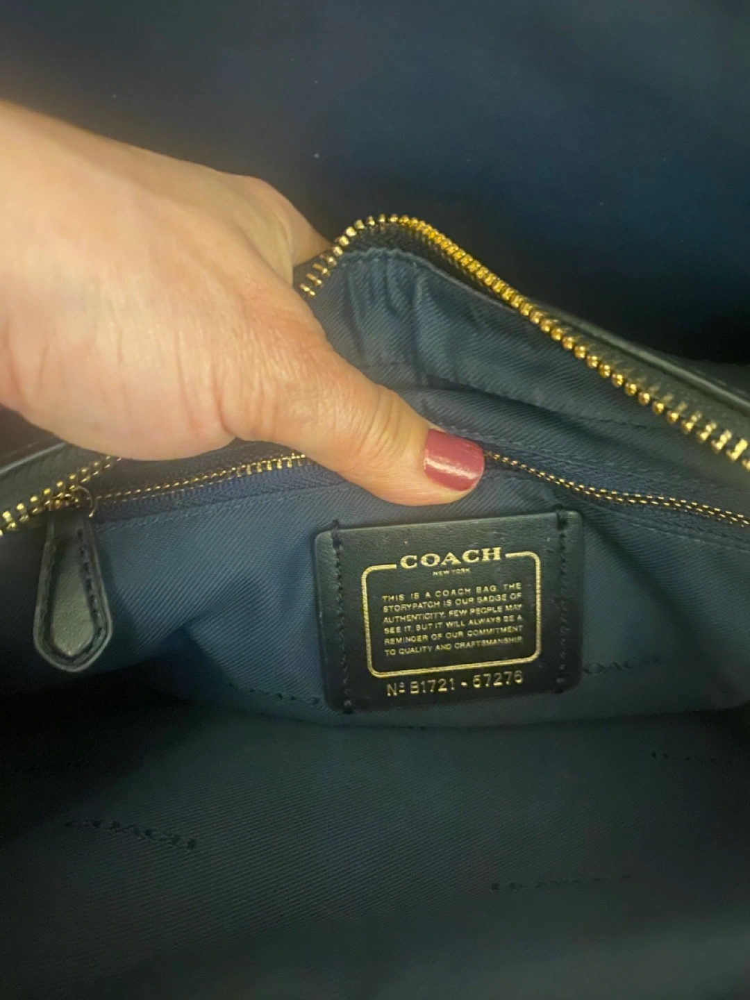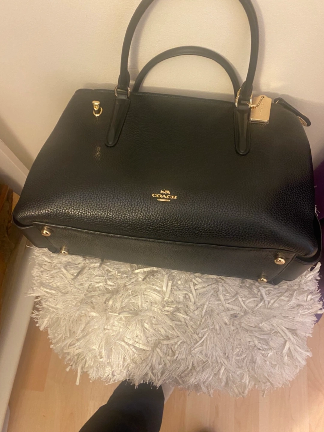 Black pebbled leather tote bag. Multiple zippered compartments. Gold-toned hardware. Double top handles.