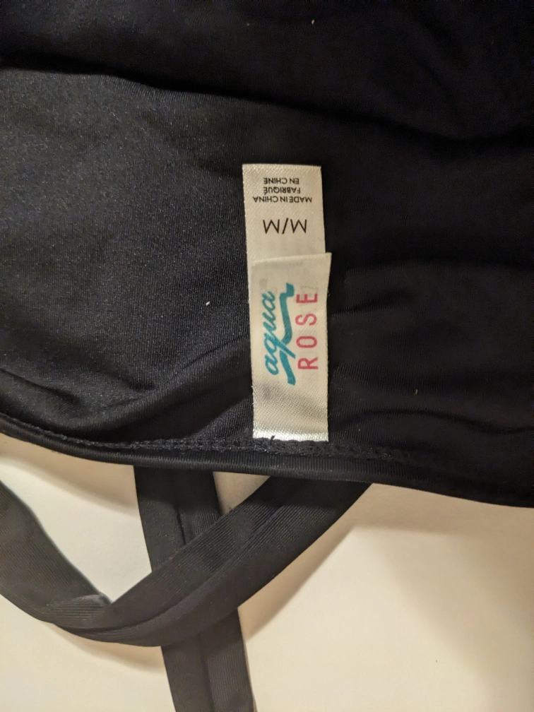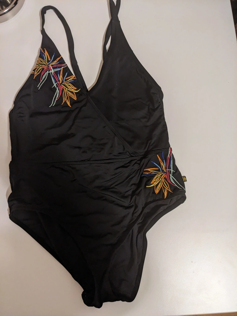 Black one-piece swimsuit. Features cross straps at the back and colourful bird embroidery. Medium size.