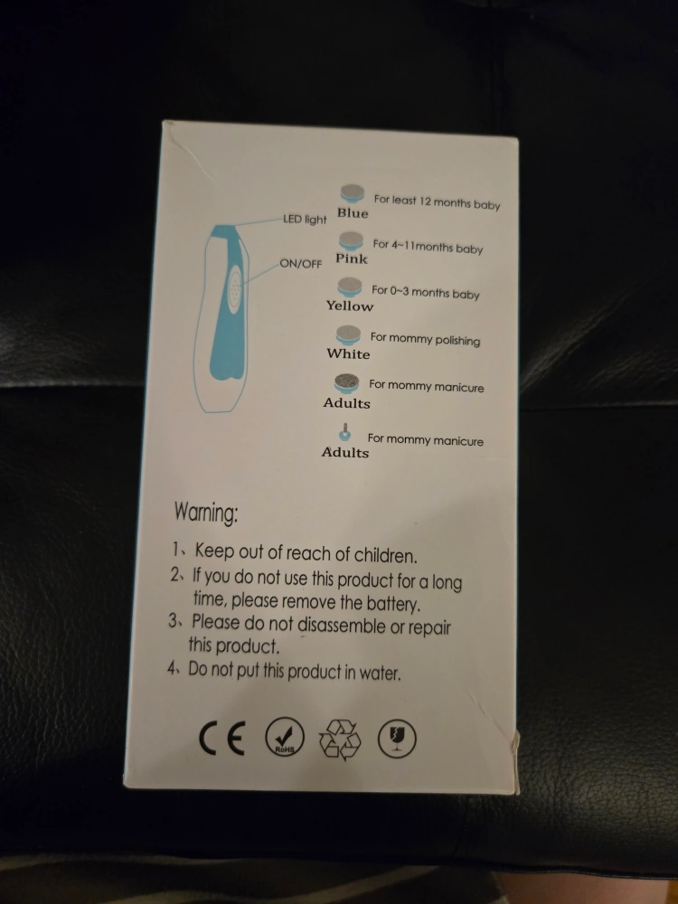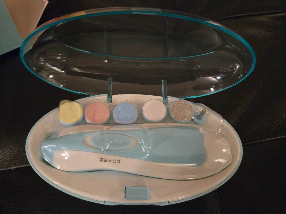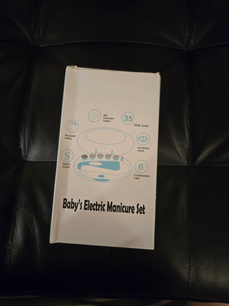 Electric baby nail filer. Six replaceable rollers for different ages and uses. Low decibel noise. Two speed settings. Comes in a protective case. New. Never used.