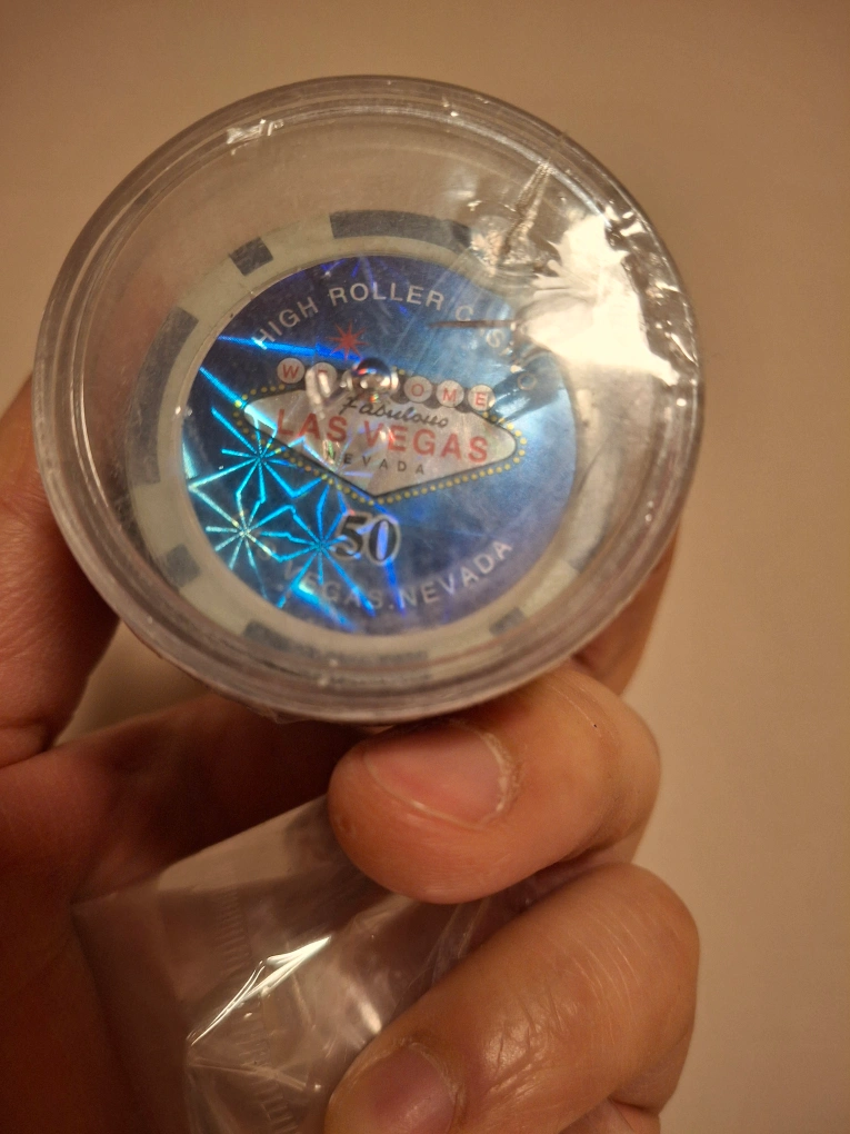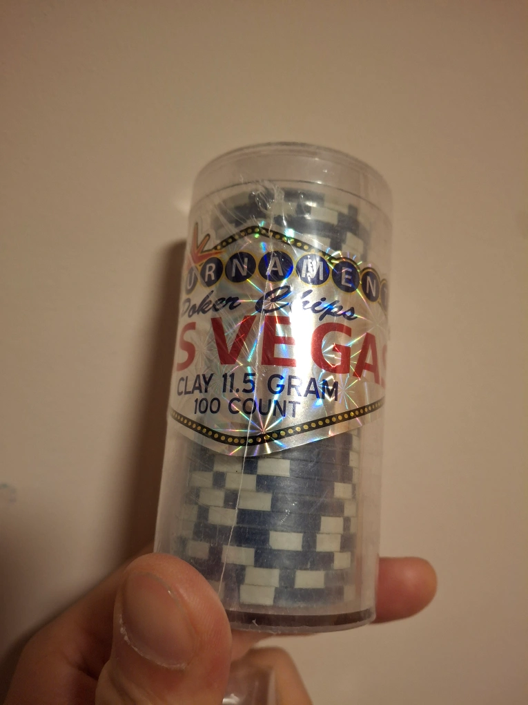 25 clay poker chips. 11.5 gram weight. Dark blue and white checkered design Unopened, but a crack in the plastic tubing