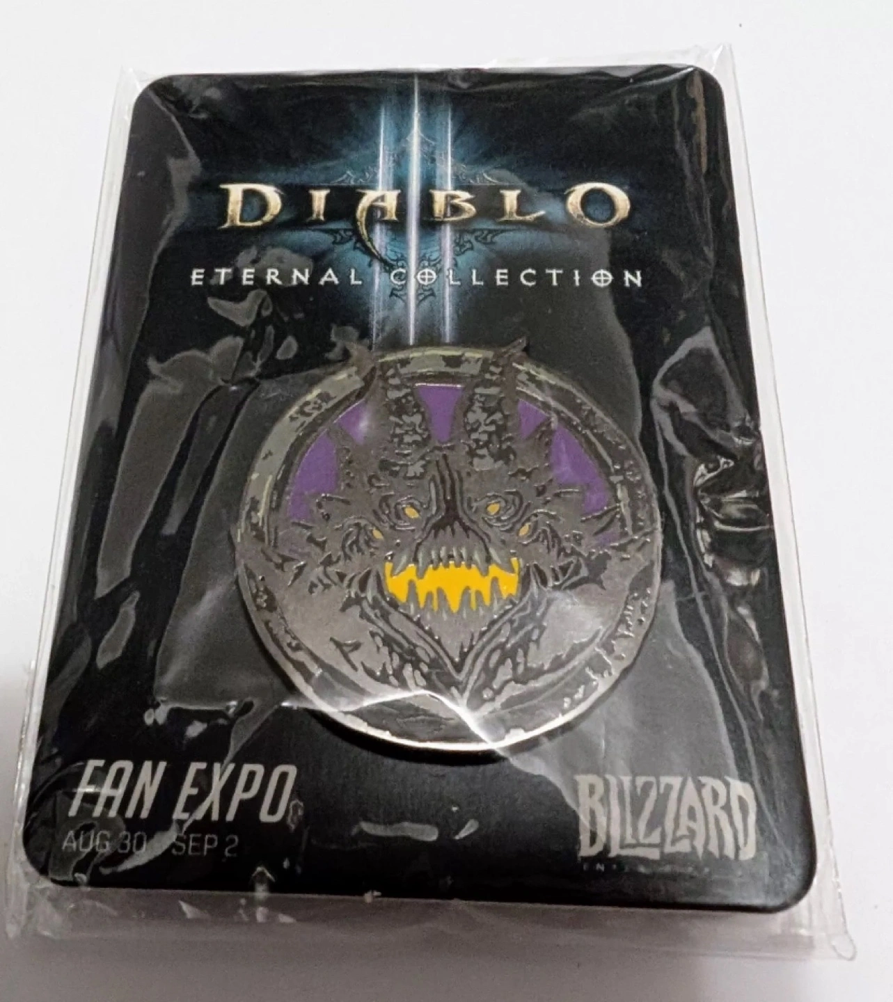 Exclusive collectible Blizzard Diablo pin. Features Diablo Eternal Collection logo. New in packaging. From BlizzCon 2018 Goes for about $100 on EBay and similar sites