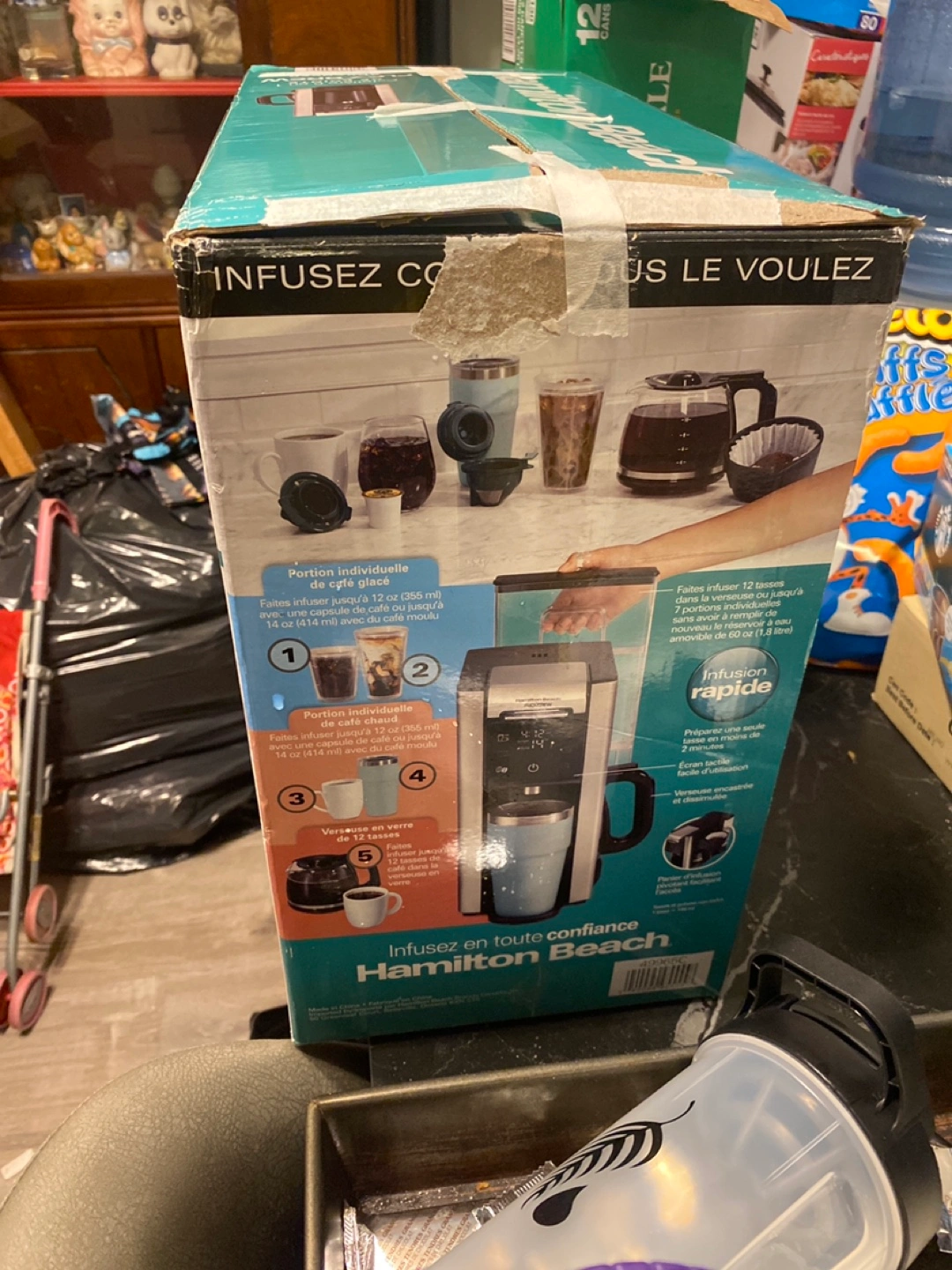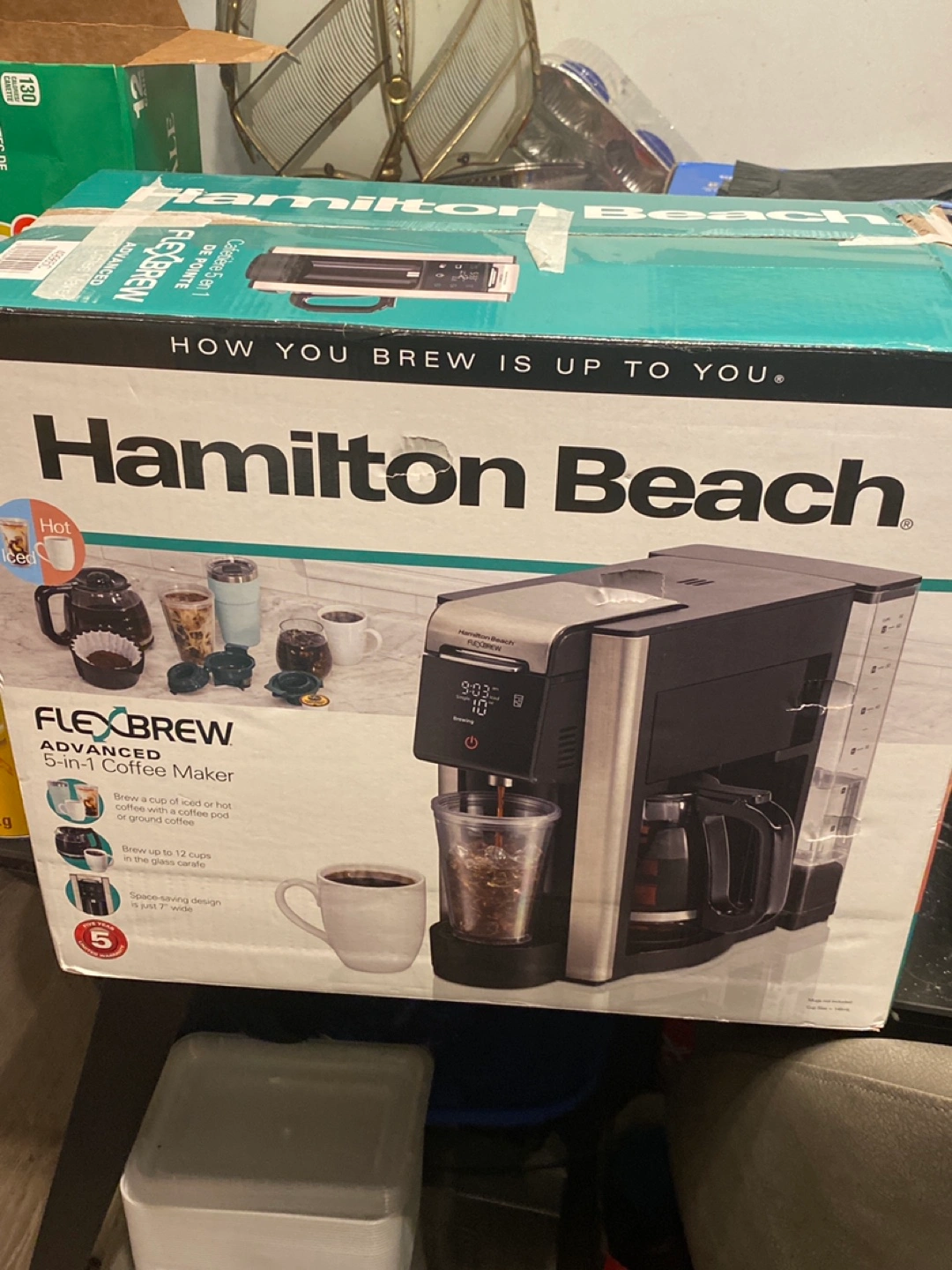 New in box. Brews iced or hot coffee. Uses pods or ground coffee. Makes up to 12 cups. Space-saving design. Can be trade or offer