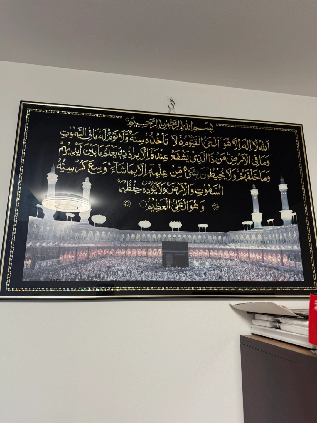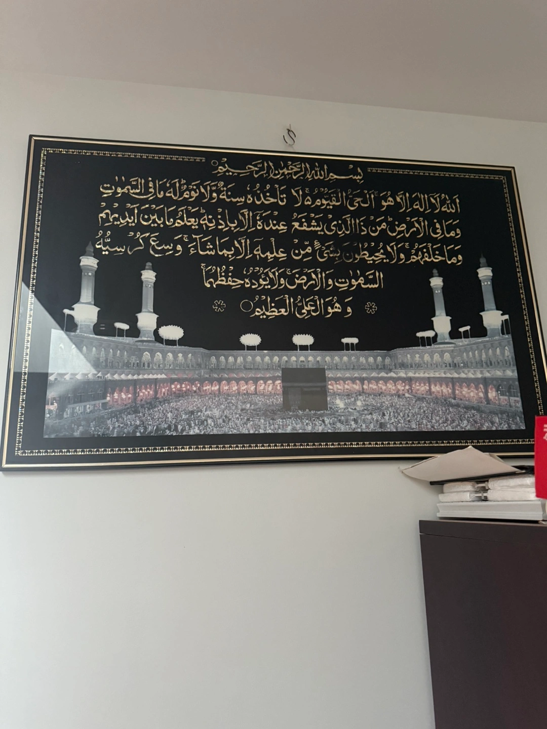 Large framed wall art. Features Islamic calligraphy and an image of the Kaaba in Mecca. Black frame. Gold lettering. Great for home or office decor. L: 30” H: 20”