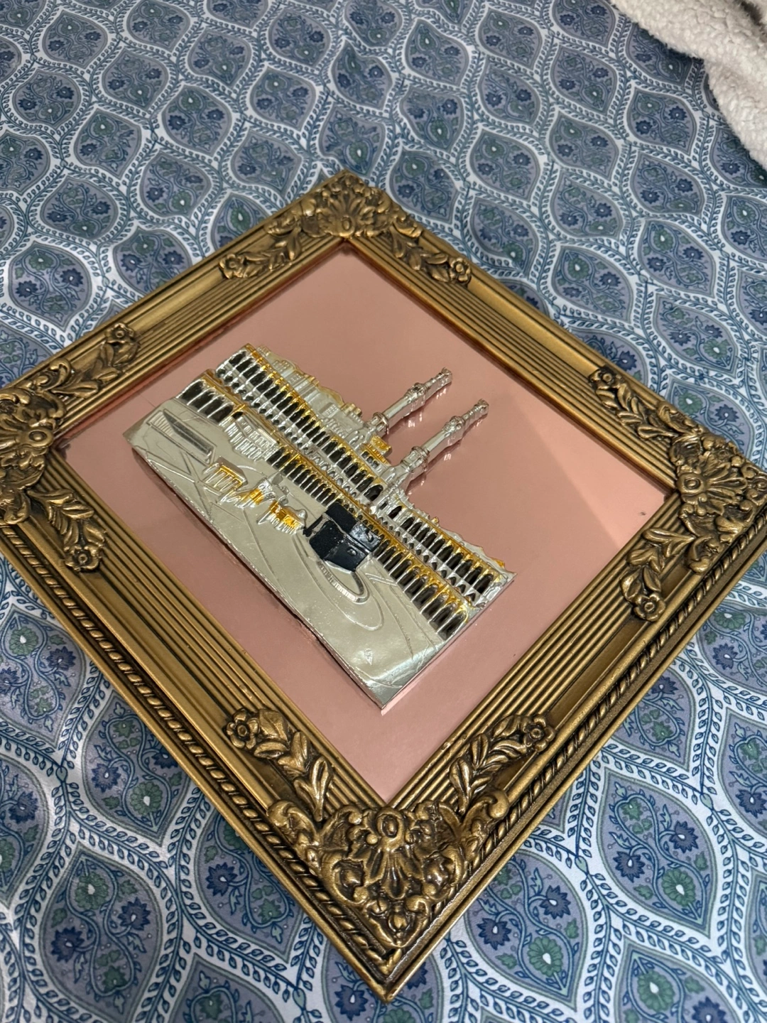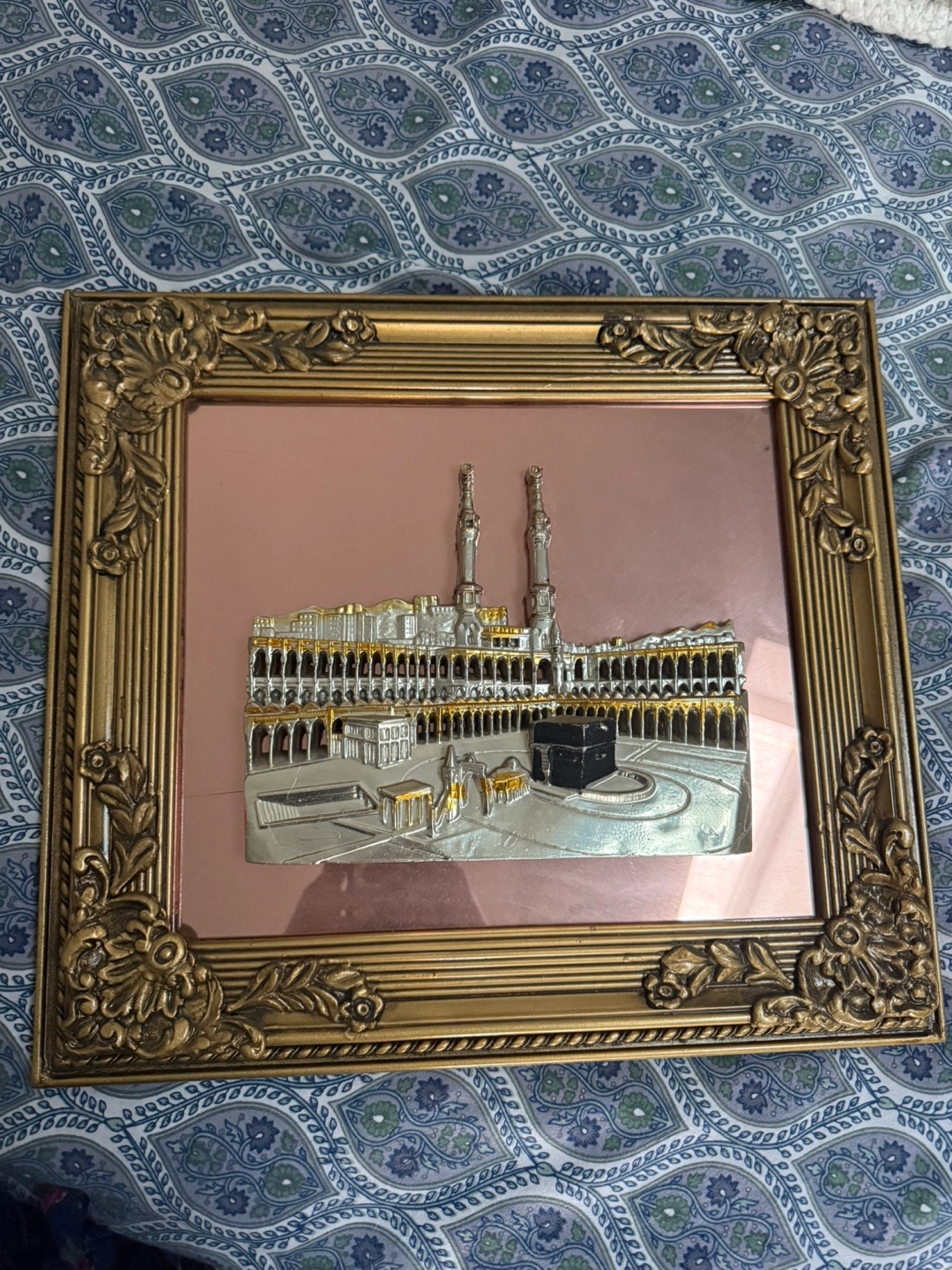 Beautiful framed 3D depiction of the Masjid al-Haram. Rose gold coloured frame with ornate detailing. Gold accents on the 3D model. Adds elegance to any room.