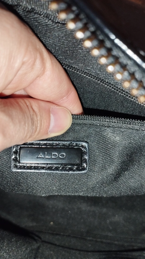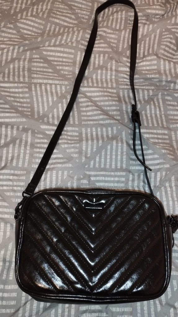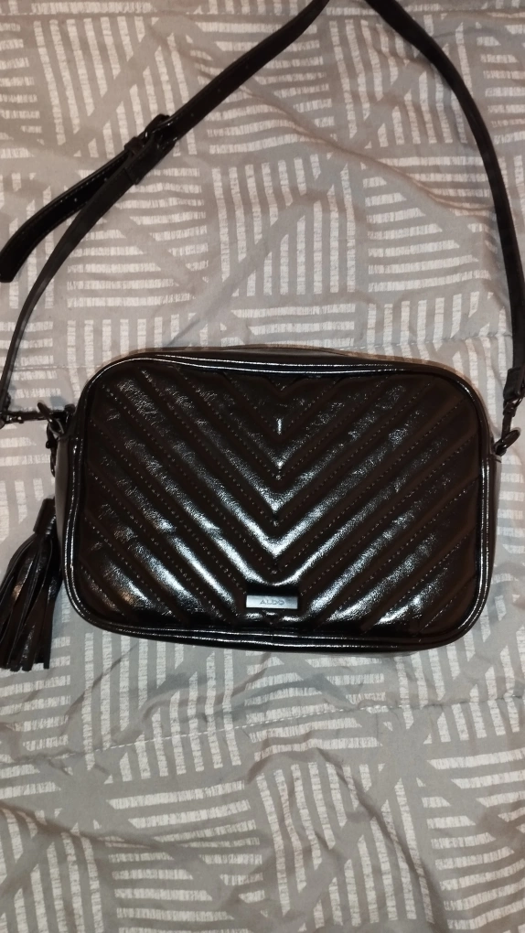 Black quilted crossbody bag. Features chevron pattern and tassel detail. Adjustable strap. Zipper closure.